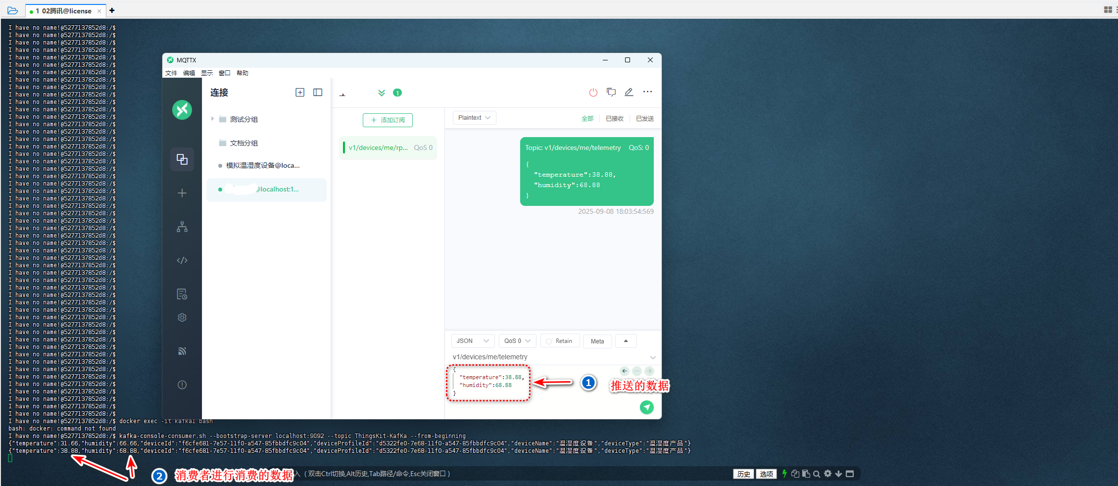 kafka-console-consumer.sh --bootstrap-server localhost:9092 --topic ThingsKit-KafKa --from-beginning如果消费者收到以下信息代表数据流转成功,如下图: