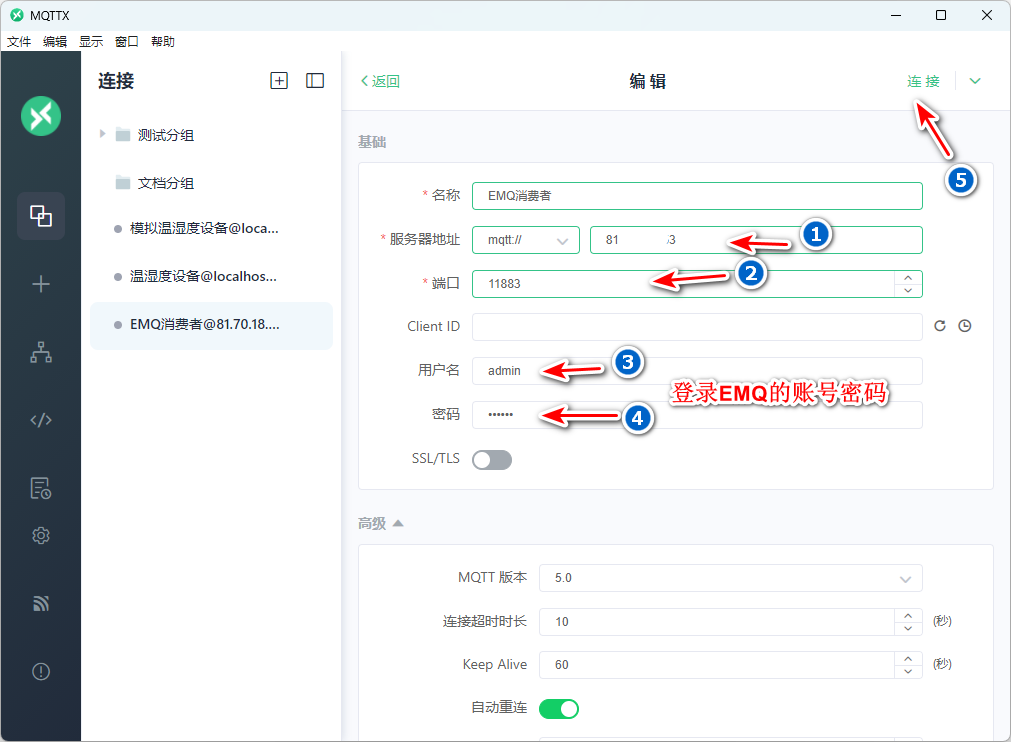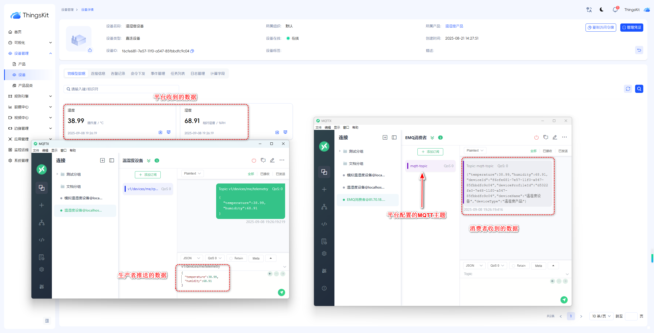 以下示例通过 MQTTX(模拟温湿度设备)、MQTTX(模拟消费者)、EMQ(模拟MQTT Broker) 进行的模拟。