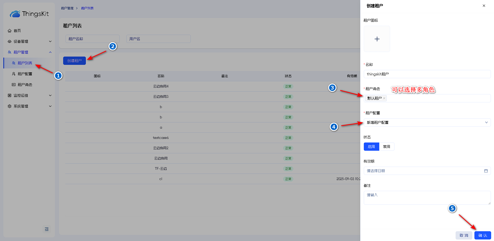 租户新增需先新增租户配置和租户角色,当然也可以选择默认的租户配置和租户角色。