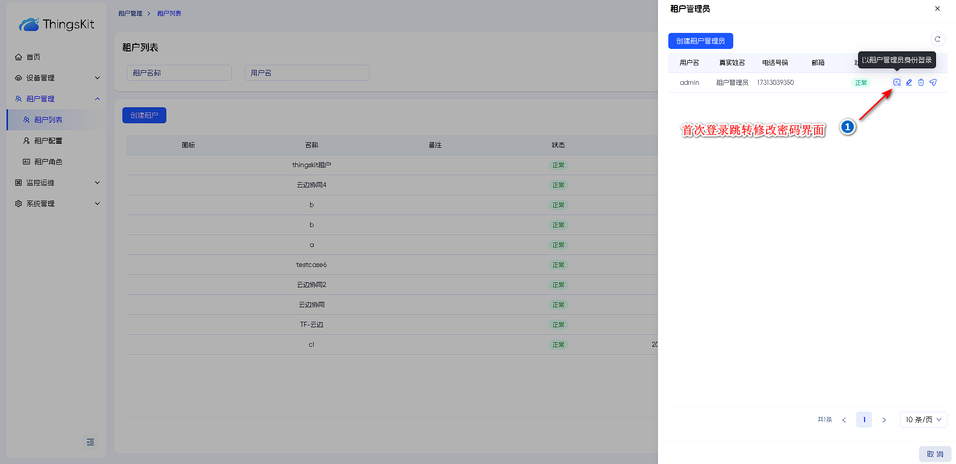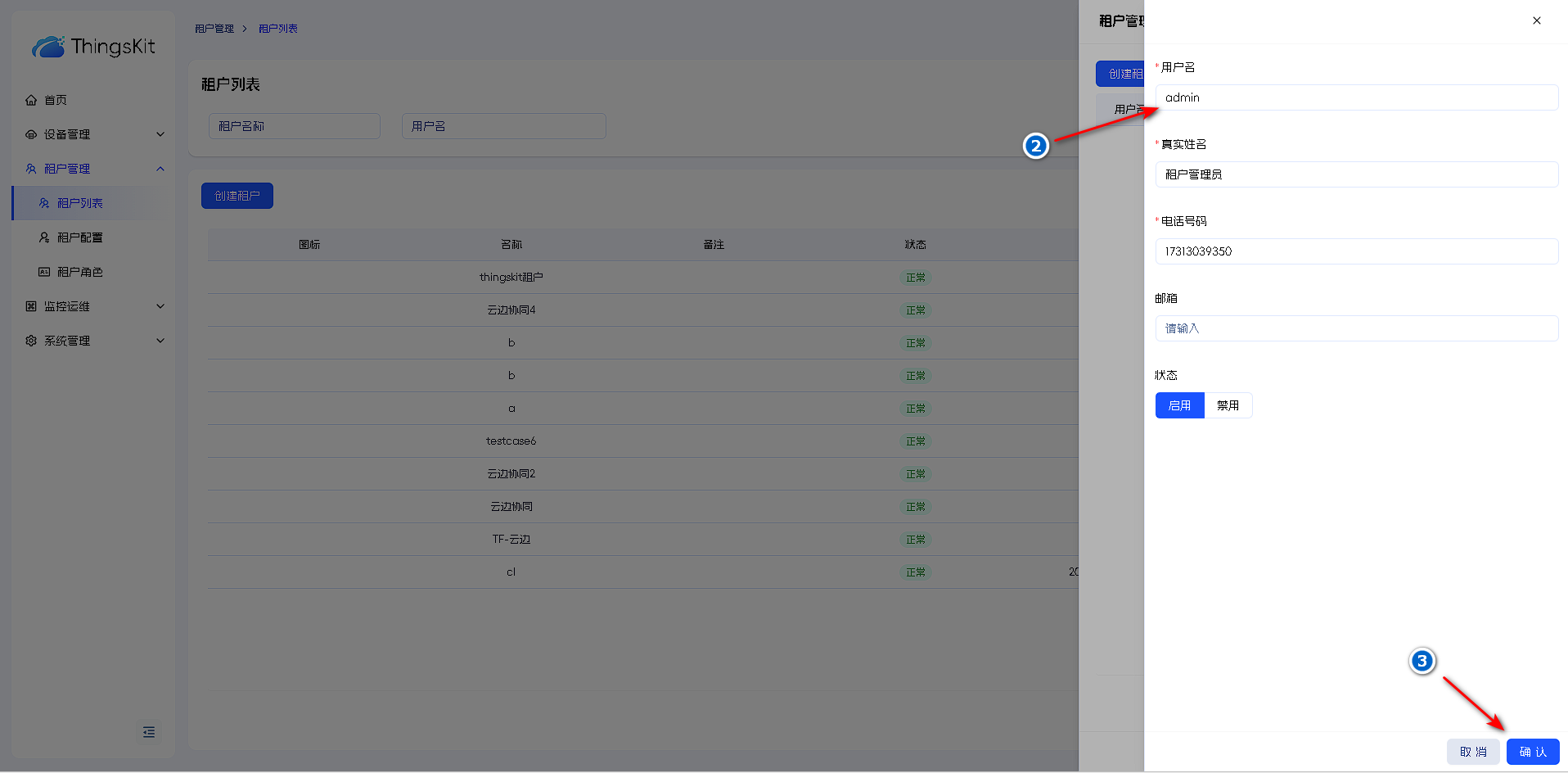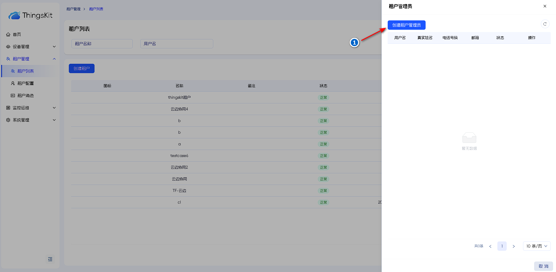 租户创建后,创建管理员账号。租户中可以创建多个租户管理员账号进行管理。