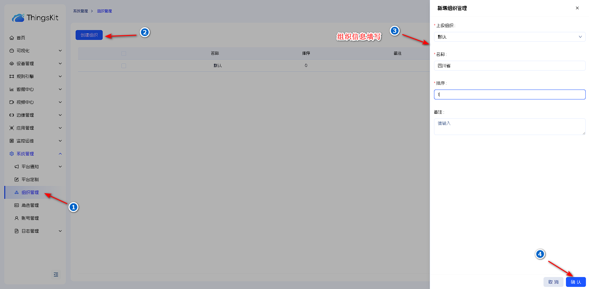 上级组织不能是此组织本身,组织创建后才方便新增其他平台功能的数据,如:新增设备,新增场景联动……