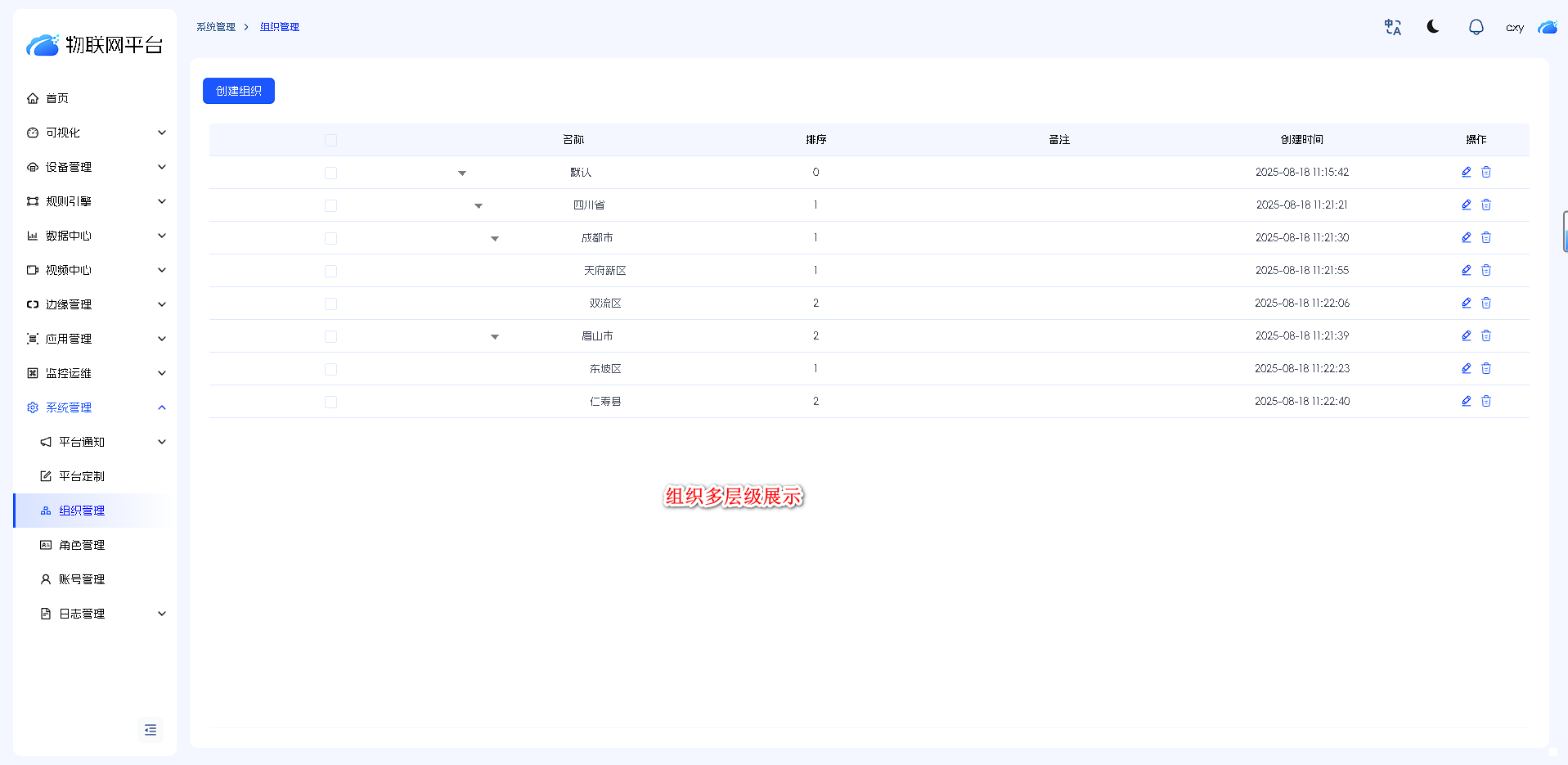 平台新账号都会有一个名为默认的最上级默认组织,用户可自行添加。