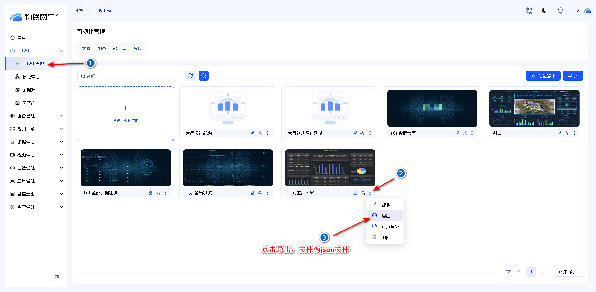 大屏导入导出的功能主要是允许用户将模板从一个可视化大屏中移动到另一个ThingsKit平台的可视化大屏中。