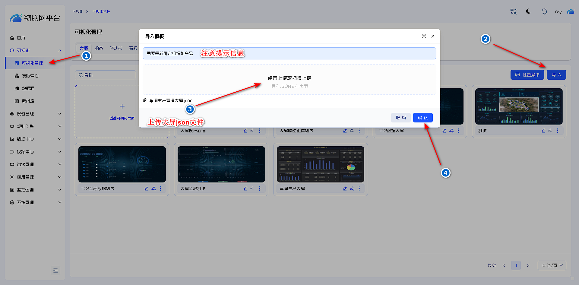 当导入时,大屏未绑定组织和产品信息,需要重新手动编辑并选择组织和产品确认。