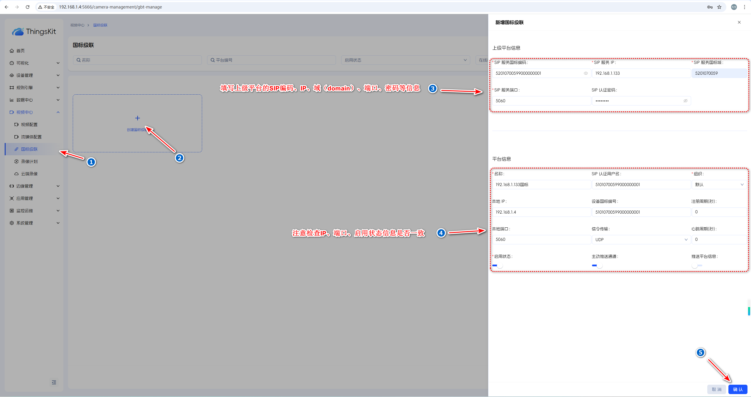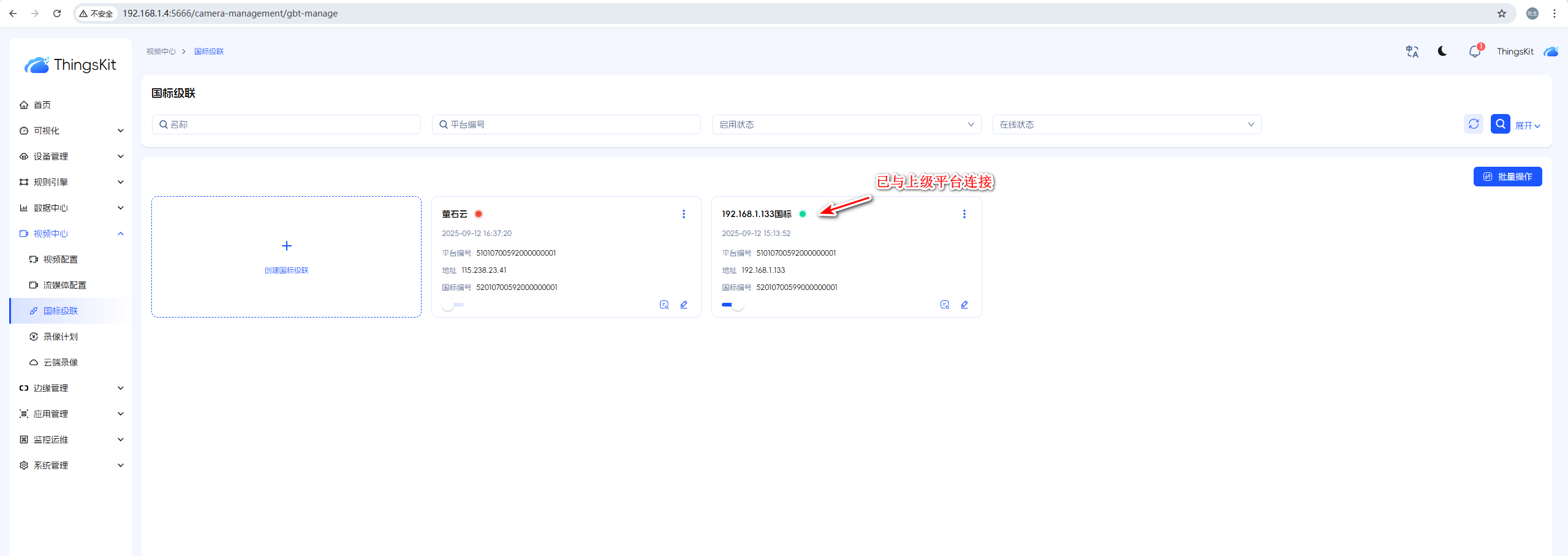 部署时thingsboard.yml里面的GBT28181_SIP_IP环境变量配置要与实际IP一致,否则国标级联连不上。