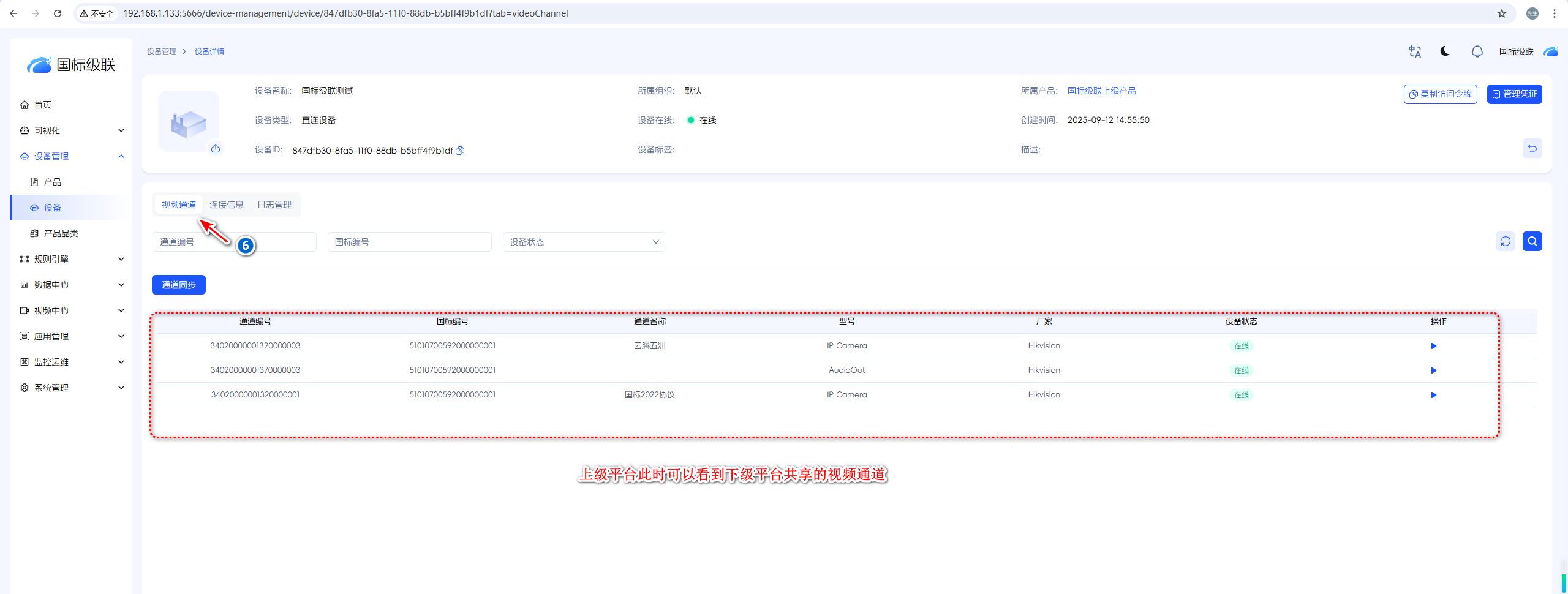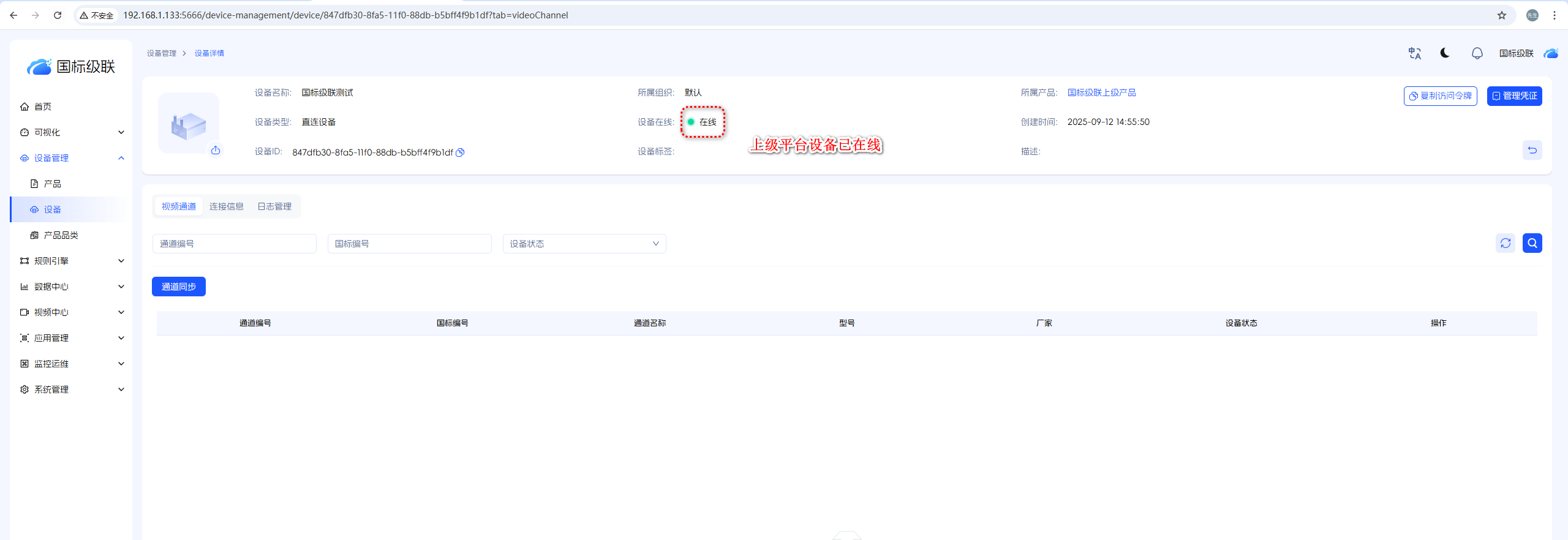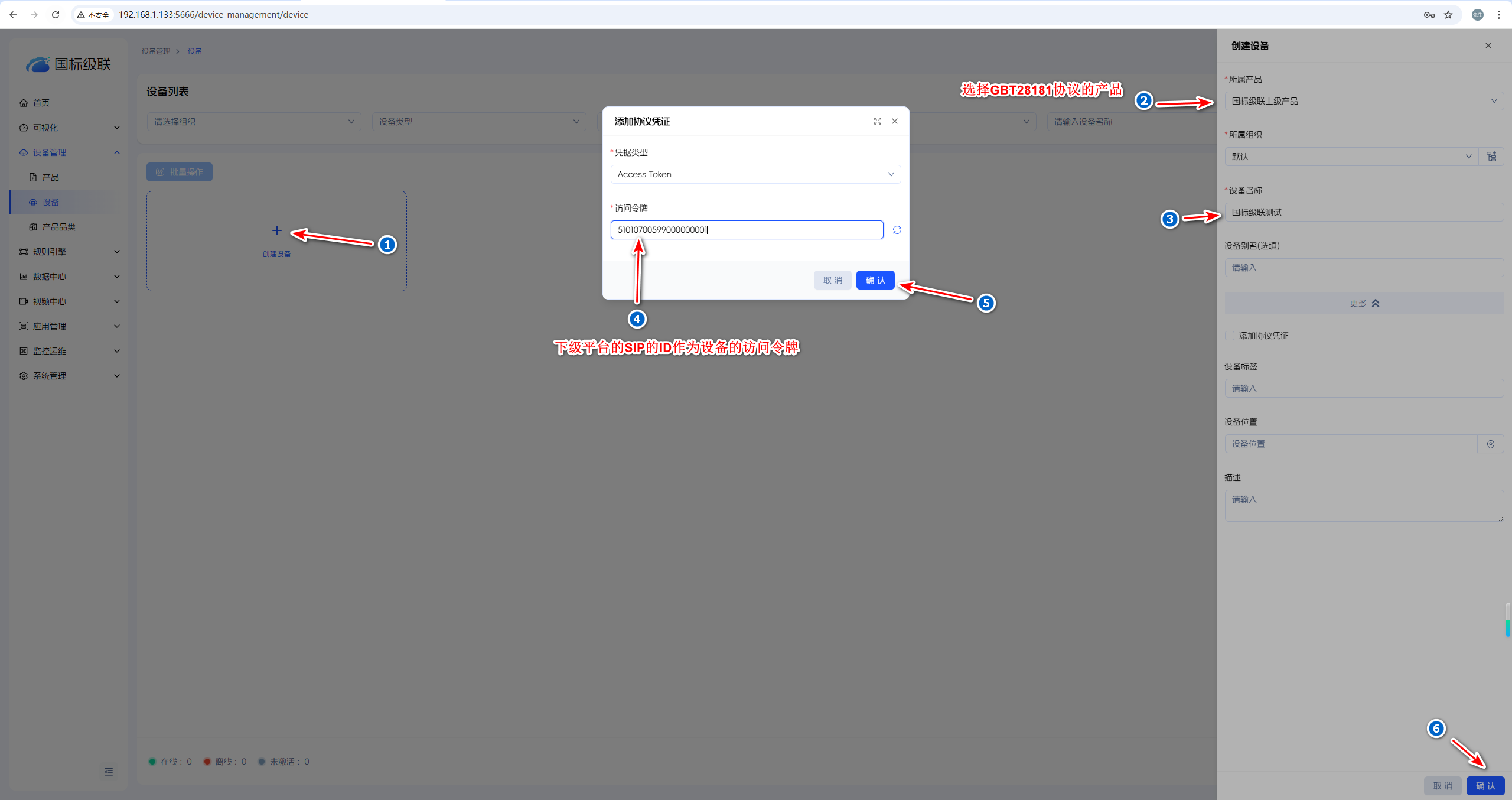 创建设备的访问令牌要与下级平台的SIP编码一致,否则上级平台关联的设备不能上线。