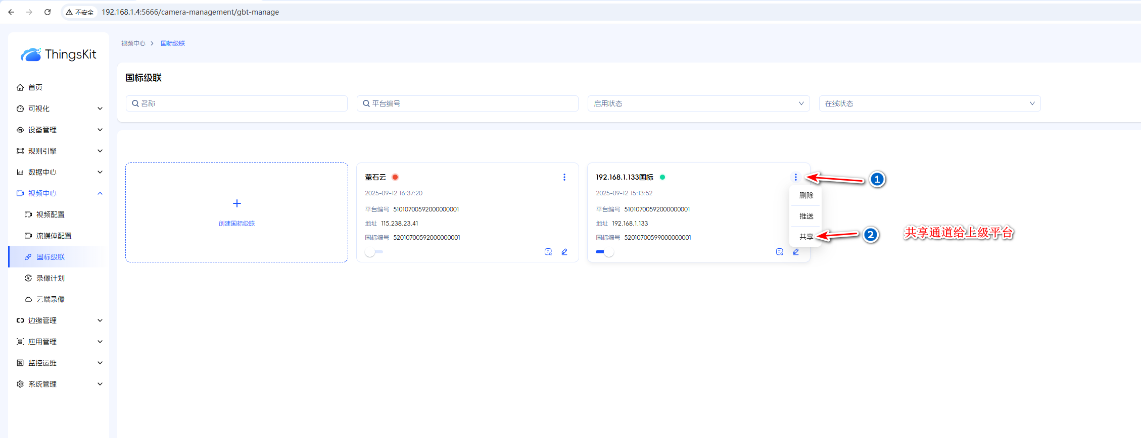两个thingskit平台进行上下级级联的场景