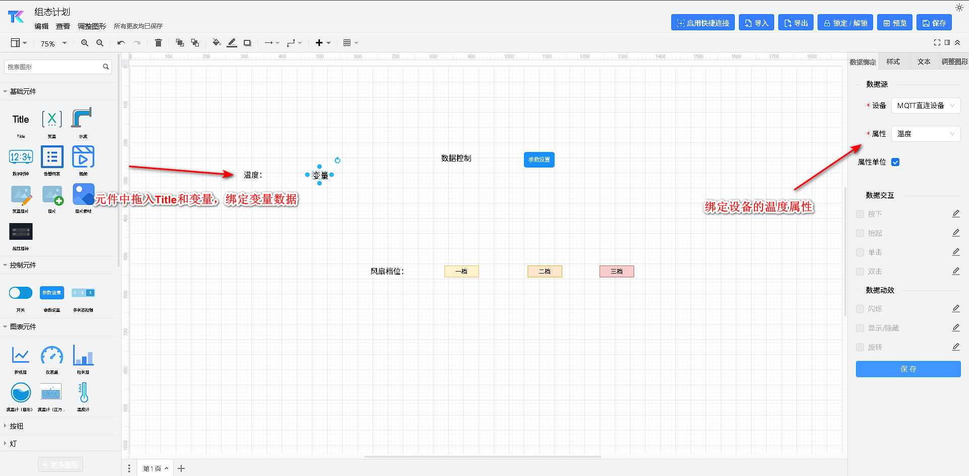 控制数据配置:通过绑定某台设备的控制属性从而在组态页面中实现对设备的控制。