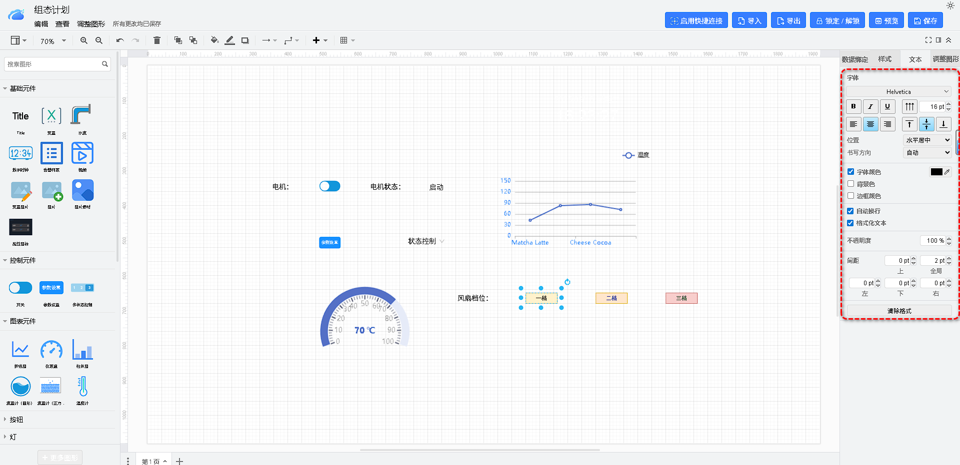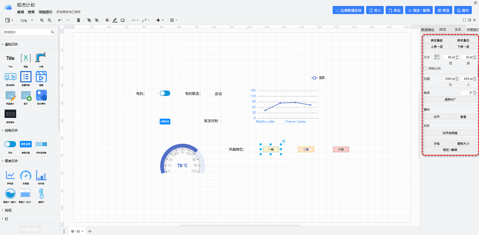 组态样式配置是指通过设置设计器中各个组件的样式属性,来改变它们的表现形式和外观。每个组件都有一些样式属性,如颜色、大小、字体、背景、边框等。通过改变这些属性,可以改变组件的外观和行为。