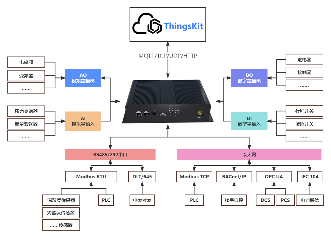 PT100热电阻、TC热电偶、PI脉冲信号、温度变送器、压力变送器、流量变送器、液位变送器、电机电流、调节阀阀位反馈;超声波流量计、电磁流量计、超声波液位计、雷达液位计、压力变送器、雷达、风速风向变送器、电流变送器、电压变送器、电量变送器…