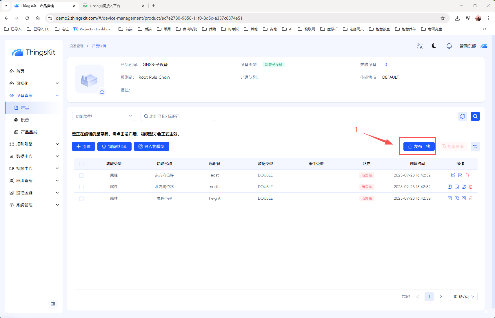 物模型,已经为您准备,导入即可。最后单击【发布上线】