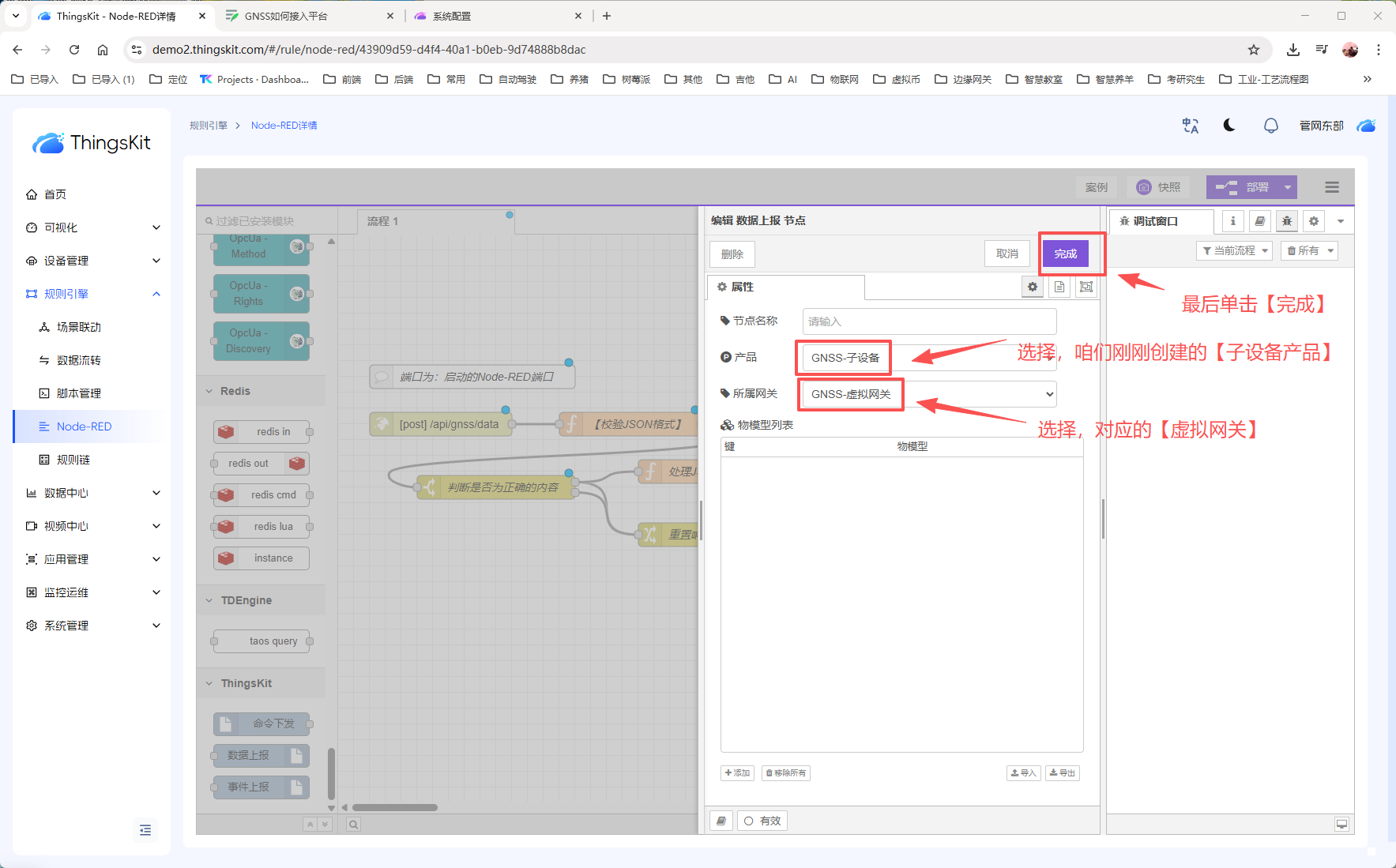 PS:这里需要配置,咱们刚刚创建的【子设备产品】;以及刚刚创建的【虚拟网关】;