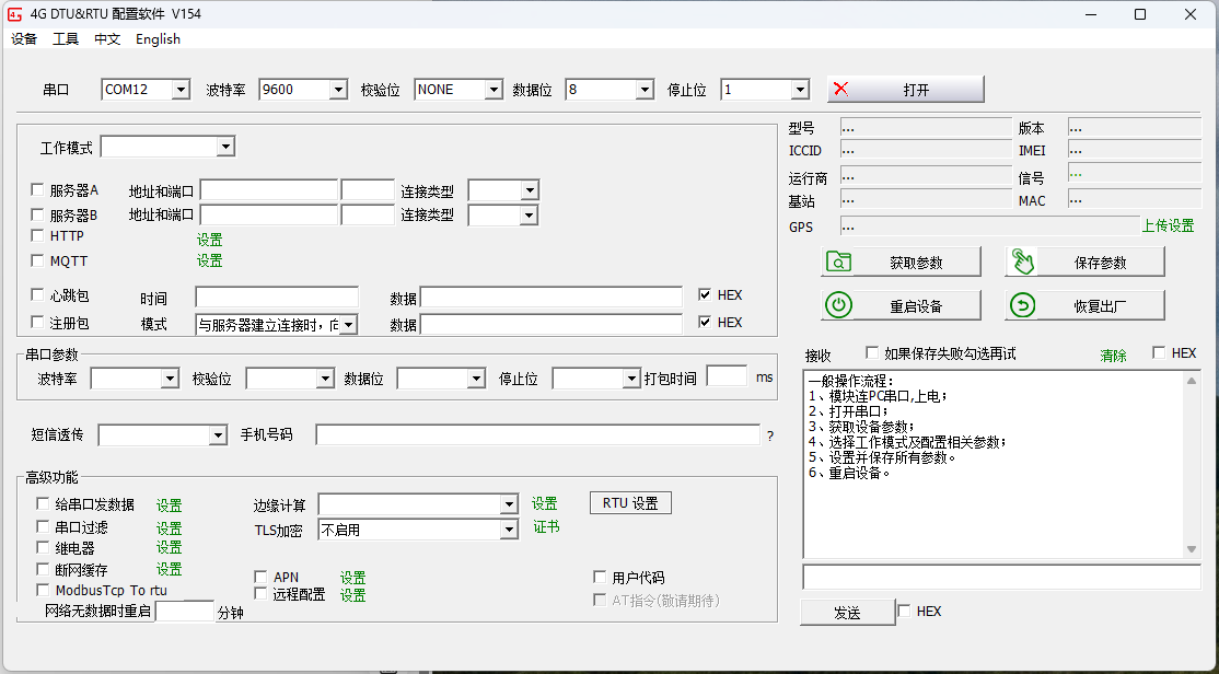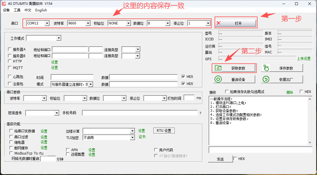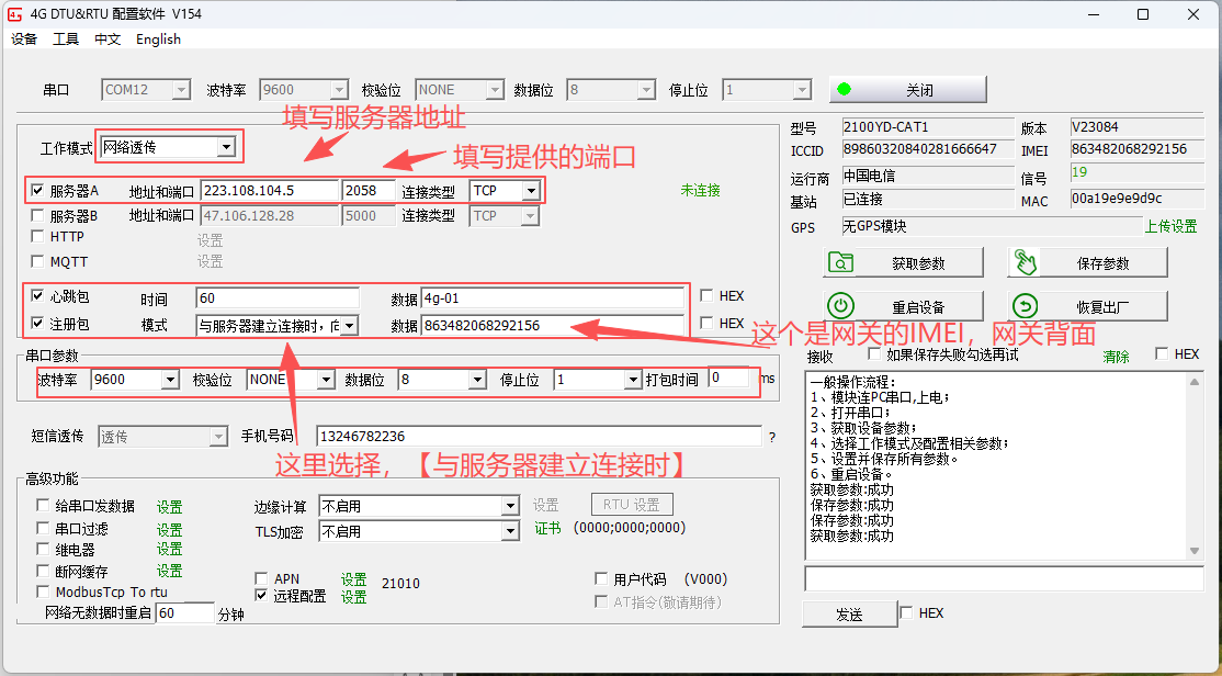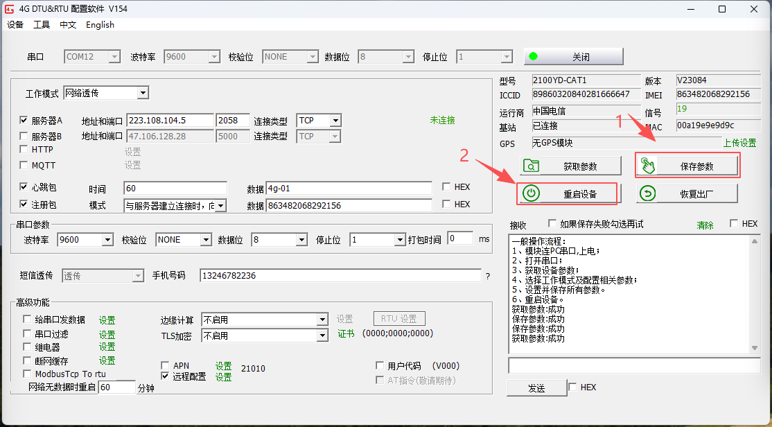 如果获取参数成功,则如下,能读取到SIM卡信息,以及设备的配置信息;
