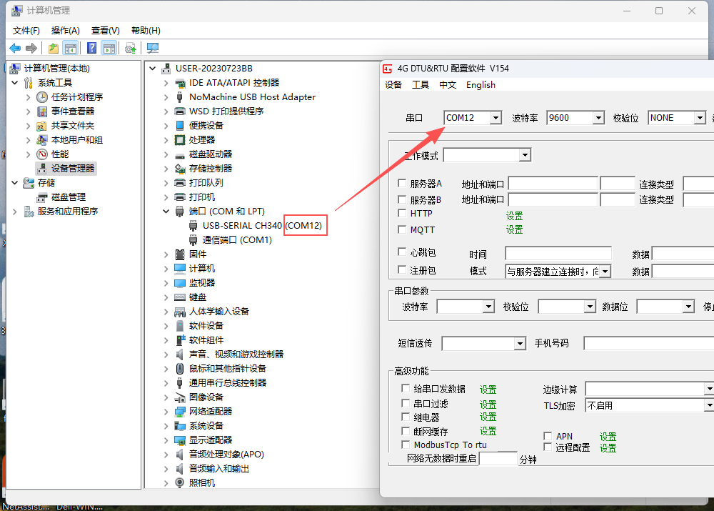 右键,我的电脑,打开【管理】,再单击【设备管理器】,找到串口号。