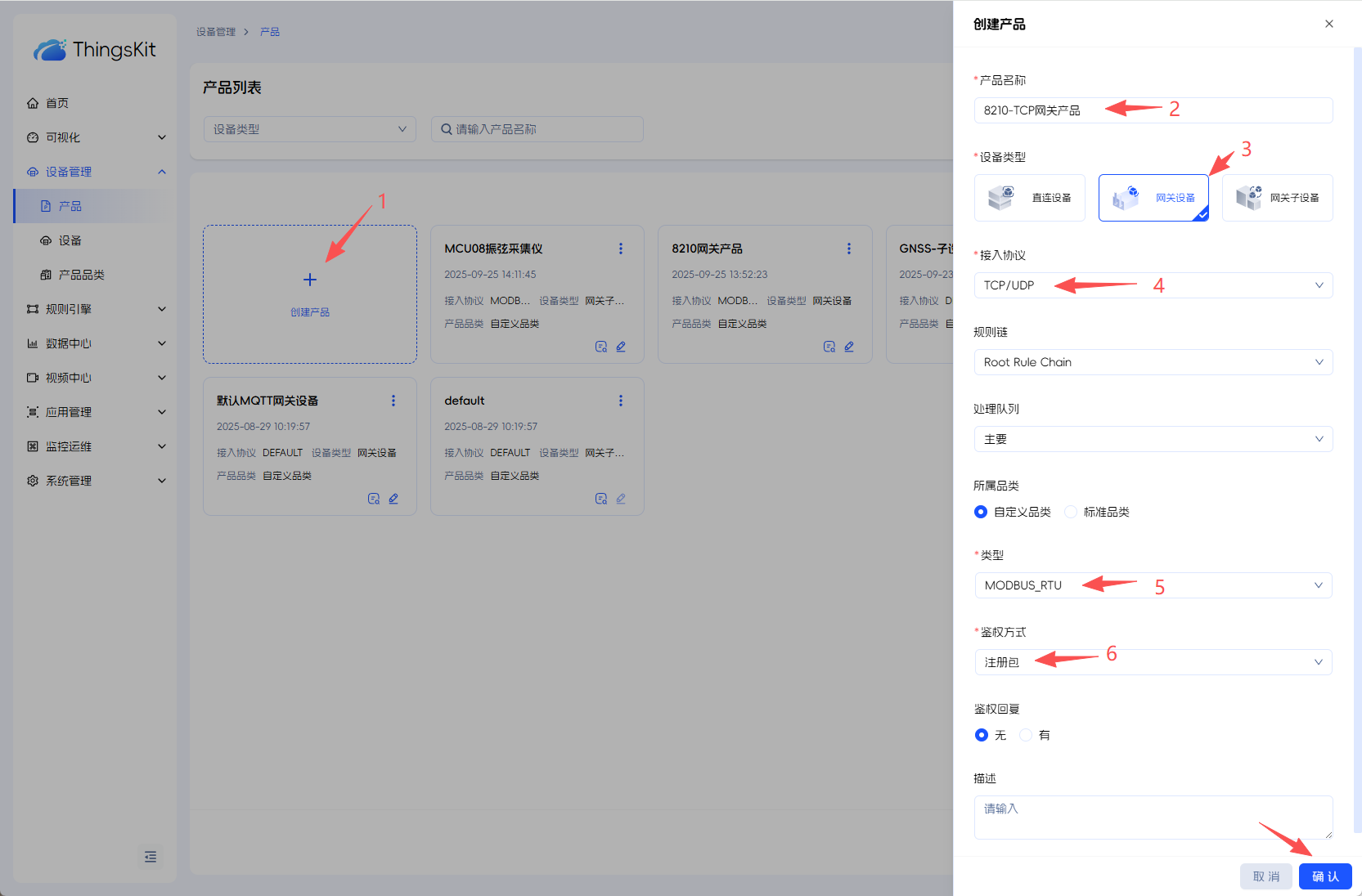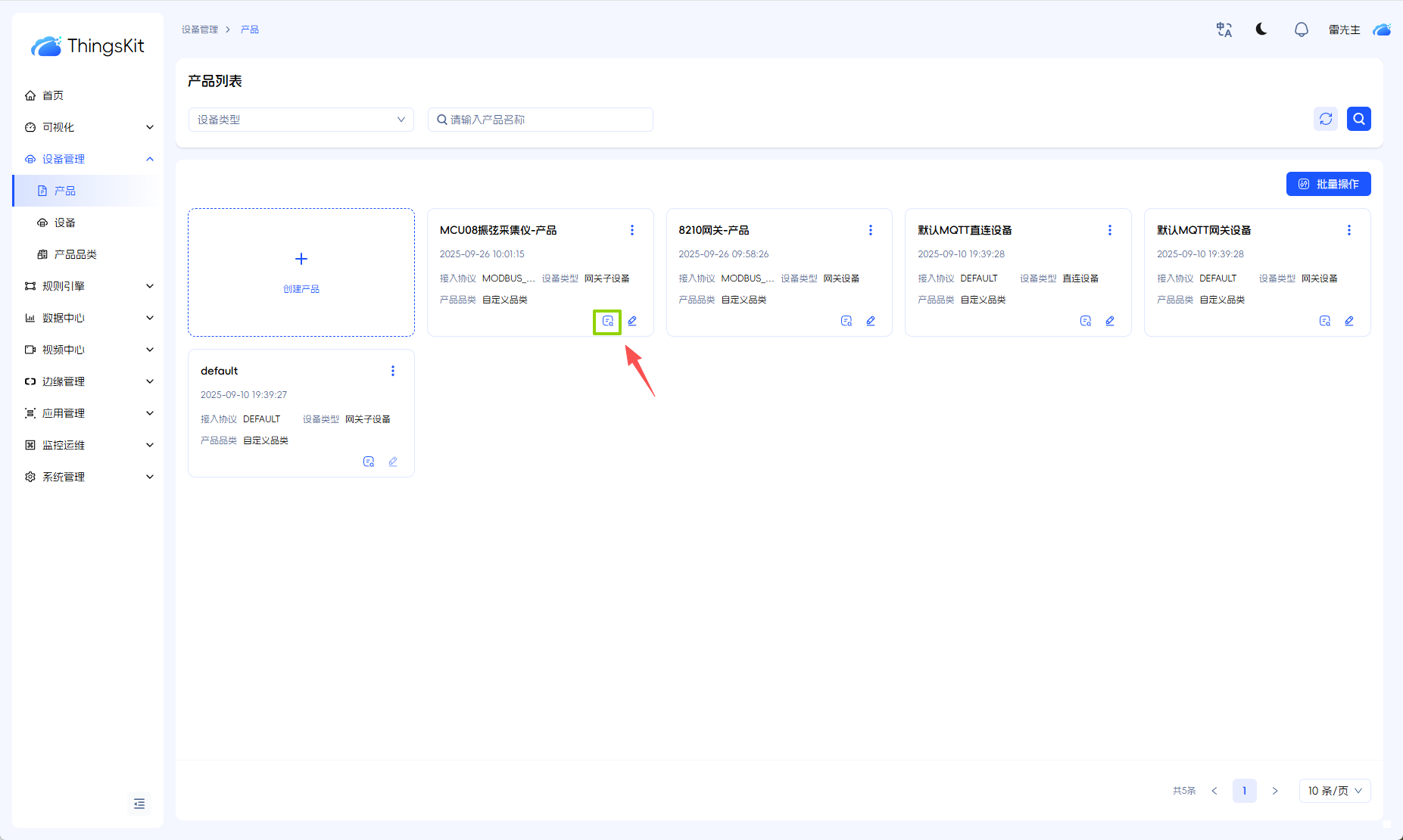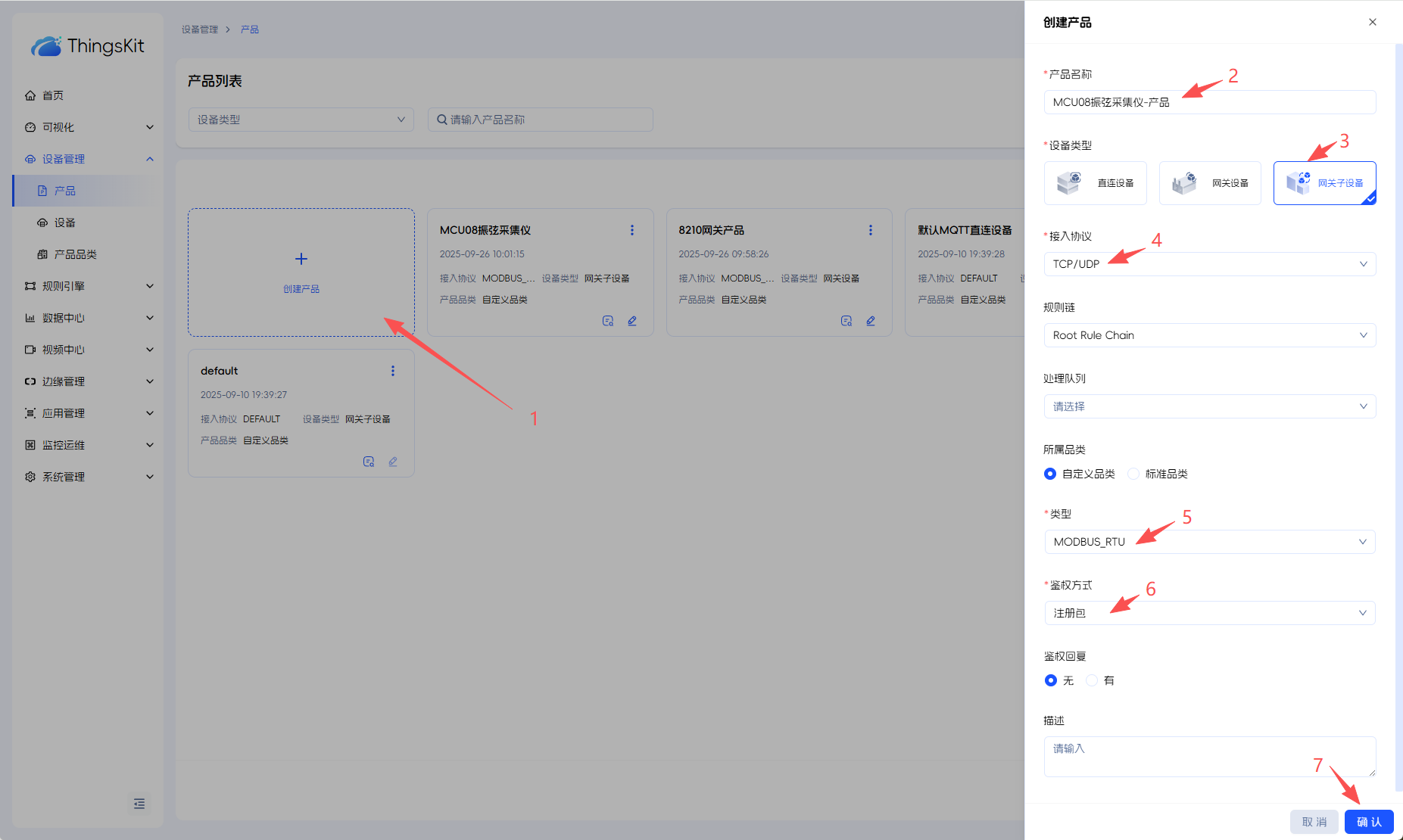 2-2-1、创建【振弦采集仪MCU08】网关子设备-产品