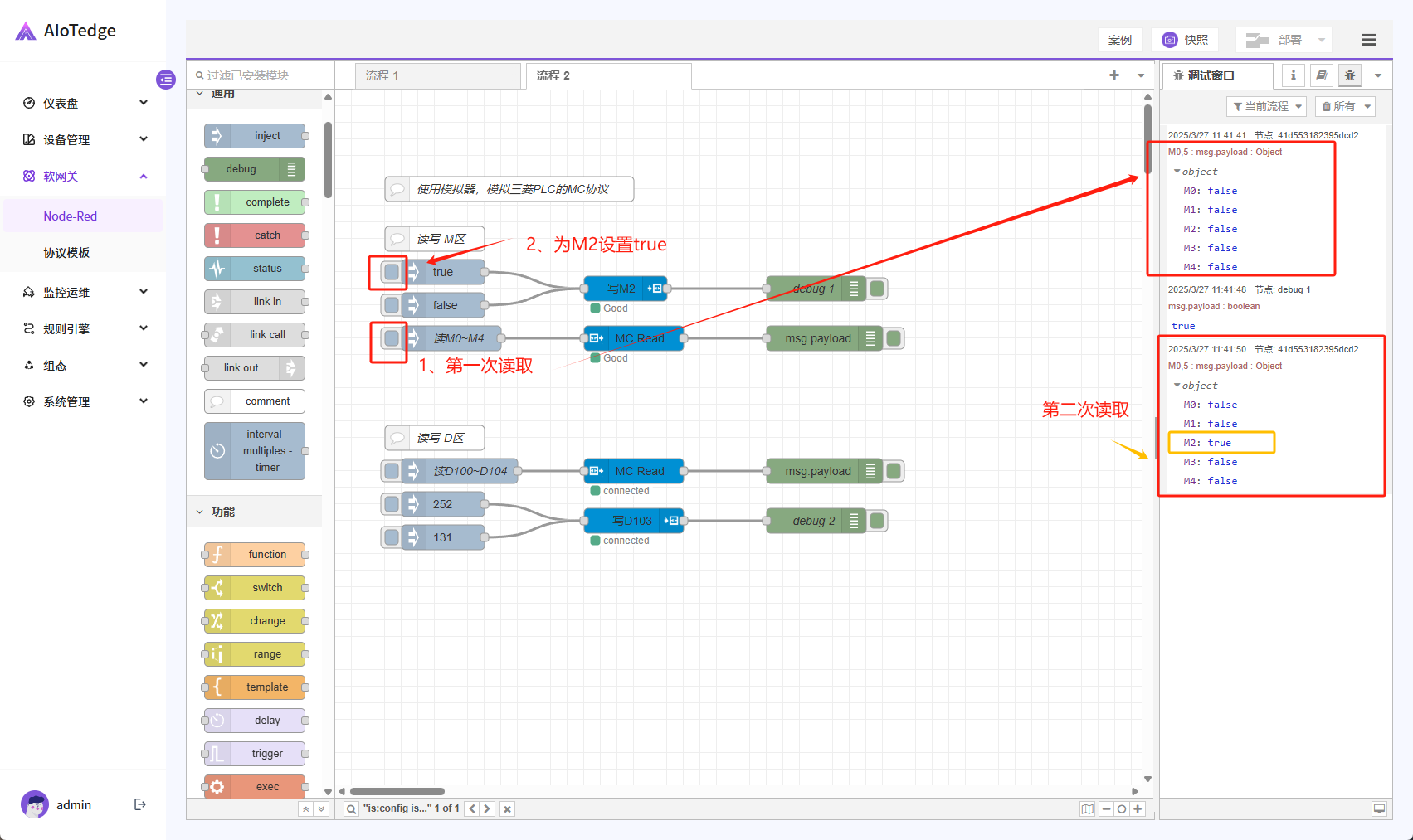 [{"id":"f49089e0696b0cdf","type":"inject","z":"92c5ceaabbcd106b","name":"","props":[{"p":"payload"}],"repeat":"","crontab":"","once":false,"onceDelay":0.1,"topic":"","payload":"true","payloadType":"bool","x":310,"y":300,"wires":[["618ff244d033c46c"]]},{"id":"3e26578cbfde157f","type":"debug","z":"92c5ceaabbcd106b","name":"debug 1","active":true,"tosidebar":true,"console":false,"tostatus":false,"complete":"payload","targetType":"msg","statusVal":"","statusType":"auto","x":760,"y":320,"wires":[]},{"id":"f3180ac40c75388e","type":"inject","z":"92c5ceaabbcd106b","name":"","props":[{"p":"payload"}],"repeat":"","crontab":"","once":false,"onceDelay":0.1,"topic":"","payload":"false","payloadType":"bool","x":310,"y":340,"wires":[["618ff244d033c46c"]]},{"id":"618ff244d033c46c","type":"MC Write","z":"92c5ceaabbcd106b","name":"写M2","topic":"","connection":"90442cec1c683b52","data":"payload","address":"M2","addressType":"str","dataType":"msg","errorHandling":"throw","outputs":1,"x":530,"y":320,"wires":[["3e26578cbfde157f"]]},{"id":"91913a3438a9770e","type":"comment","z":"92c5ceaabbcd106b","name":"使用模拟器,模拟三菱PLC的MC协议","info":"http://www.hslcommunication.cn/nn注意:本地测试,必须关闭防火墙;否则无效","x":390,"y":200,"wires":[]},{"id":"975fb8394172cf5b","type":"inject","z":"92c5ceaabbcd106b","name":"","props":[{"p":"payload"}],"repeat":"","crontab":"","once":false,"onceDelay":0.1,"topic":"","payload":"252","payloadType":"num","x":310,"y":580,"wires":[["b721c88e95d664c1"]]},{"id":"ae607229502ffb11","type":"debug","z":"92c5ceaabbcd106b","name":"debug 2","active":true,"tosidebar":true,"console":false,"tostatus":false,"complete":"false","statusVal":"","statusType":"auto","x":760,"y":600,"wires":[]},{"id":"811f6eca3cfac574","type":"inject","z":"92c5ceaabbcd106b","name":"","props":[{"p":"payload"}],"repeat":"","crontab":"","once":false,"onceDelay":0.1,"topic":"","payload":"131","payloadType":"num","x":310,"y":620,"wires":[["b721c88e95d664c1"]]},{"id":"b721c88e95d664c1","type":"MC Write","z":"92c5ceaabbcd106b","name":"写D103","topic":"","connection":"90442cec1c683b52","data":"payload","address":"D103","addressType":"str","dataType":"msg","errorHandling":"throw","outputs":1,"x":540,"y":600,"wires":[["ae607229502ffb11"]]},{"id":"c475874181da80b5","type":"MC Read","z":"92c5ceaabbcd106b","name":"","topic":"","connection":"90442cec1c683b52","address":"topic","addressType":"msg","outputFormat":0,"errorHandling":"throw","outputs":1,"x":540,"y":380,"wires":[["41d553182395dcd2"]]},{"id":"41d553182395dcd2","type":"debug","z":"92c5ceaabbcd106b","name":"","active":true,"tosidebar":true,"console":false,"tostatus":false,"complete":"payload","targetType":"msg","statusVal":"","statusType":"auto","x":770,"y":380,"wires":[]},{"id":"5a2e438501247914","type":"inject","z":"92c5ceaabbcd106b","name":"读M0~M4","props":[{"p":"topic","vt":"str"},{"p":"payload"}],"repeat":"","crontab":"","once":false,"onceDelay":0.1,"topic":"M0,5","payload":"","payloadType":"str","x":320,"y":380,"wires":[["c475874181da80b5"]]},{"id":"3280da4cf65e1e52","type":"MC Read","z":"92c5ceaabbcd106b","name":"","topic":"","connection":"90442cec1c683b52","address":"topic","addressType":"msg","outputFormat":0,"errorHandling":"throw","outputs":1,"x":540,"y":540,"wires":[["66556bec359771ed"]]},{"id":"66556bec359771ed","type":"debug","z":"92c5ceaabbcd106b","name":"","active":true,"tosidebar":true,"console":false,"tostatus":false,"complete":"payload","targetType":"msg","statusVal":"","statusType":"auto","x":770,"y":540,"wires":[]},{"id":"d6304bb4b08e08df","type":"inject","z":"92c5ceaabbcd106b","name":"读D100~D104","props":[{"p":"topic","vt":"str"},{"p":"payload"}],"repeat":"","crontab":"","once":false,"onceDelay":0.1,"topic":"D100,5","payload":"","payloadType":"str","x":330,"y":540,"wires":[["3280da4cf65e1e52"]]},{"id":"c77b8ce9ceb514fe","type":"comment","z":"92c5ceaabbcd106b","name":"读写-M区","info":"","x":300,"y":260,"wires":[]},{"id":"e6644bd2ec1603d4","type":"comment","z":"92c5ceaabbcd106b","name":"读写-D区","info":"","x":300,"y":500,"wires":[]},{"id":"90442cec1c683b52","type":"MC Protocol Connection","name":"","host":"192.168.1.53","port":"5001","protocol":"TCP","frame":"3E","plcType":"Q","ascii":false,"PLCStation":"","PCStation":"","PLCModuleNo":"","network":"","octalInputOutput":false,"timeout":"1000"}]