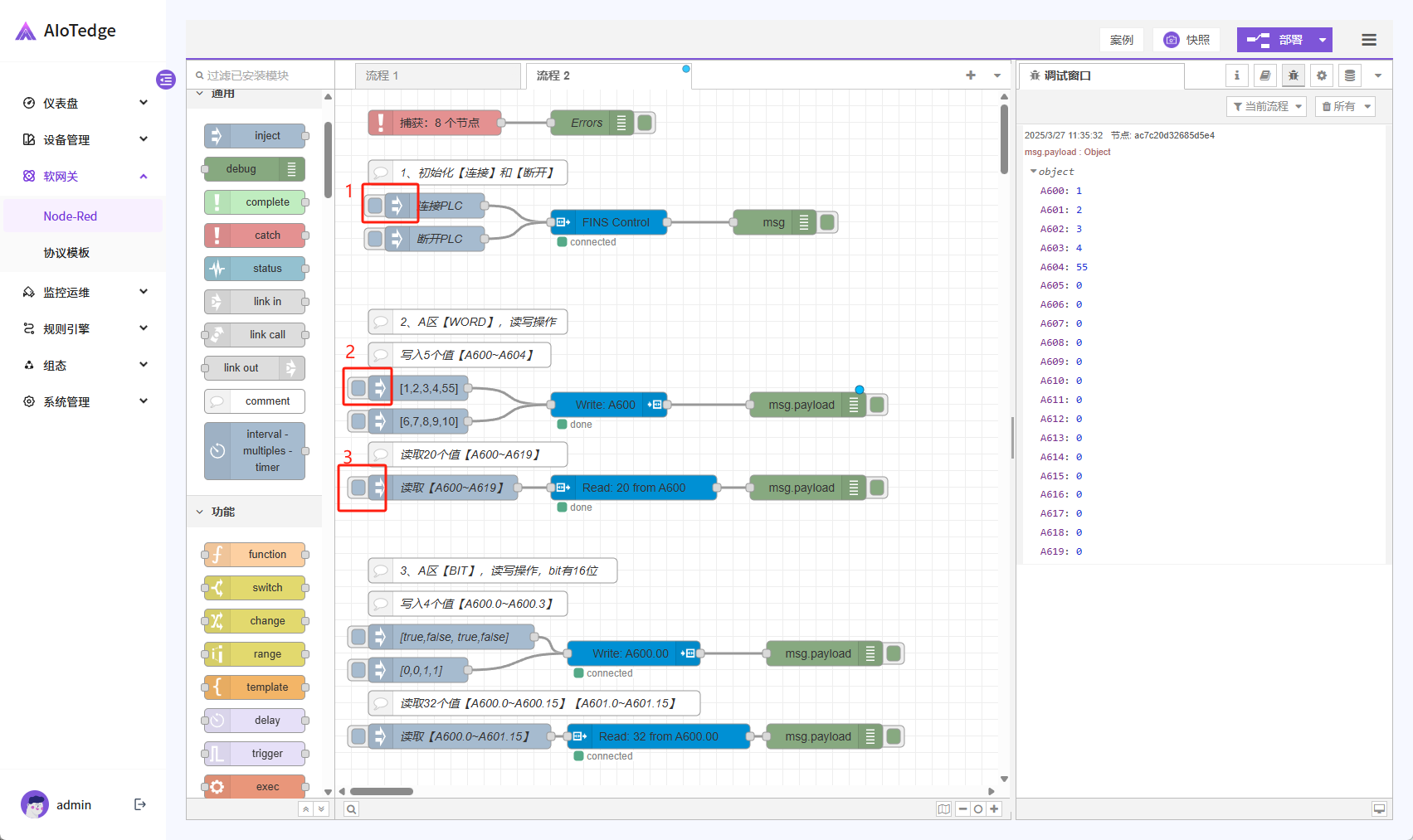 [{"id":"beb6e99a0b8ad072","type":"FINS Control","z":"92c5ceaabbcd106b","name":"","connection":"97172f6a093bad4f","clockType":"json","clock":"","connectOptionsType":"msg","connectOptions":"options","msgPropertyType":"msg","msgProperty":"payload","commandType":"msg","command":"topic","x":330,"y":160,"wires":[["dc0a0d6f2be841b6"]]},{"id":"dc0a0d6f2be841b6","type":"debug","z":"92c5ceaabbcd106b","name":"","active":true,"tosidebar":true,"console":false,"tostatus":true,"complete":"true","targetType":"full","statusVal":"payload","statusType":"msg","x":530,"y":160,"wires":[]},{"id":"817cb22e32480395","type":"inject","z":"92c5ceaabbcd106b","name":"连接PLC","props":[{"p":"topic","vt":"str"},{"p":"options","v":"{"host":"192.168.1.53","port":9600,"protocol":"tcp","DNA":0,"DA1":120,"DA2":0,"SNA":0,"SA1":38,"SA2":0}","vt":"json"}],"repeat":"","crontab":"","once":false,"onceDelay":0.1,"topic":"connect","x":120,"y":140,"wires":[["beb6e99a0b8ad072"]]},{"id":"be70389b5d1029b8","type":"inject","z":"92c5ceaabbcd106b","name":"断开PLC","props":[{"p":"topic","vt":"str"}],"repeat":"","crontab":"","once":false,"onceDelay":0.1,"topic":"disconnect","x":120,"y":180,"wires":[["beb6e99a0b8ad072"]]},{"id":"a3a3af5458539066","type":"FINS Write","z":"92c5ceaabbcd106b","name":"","connection":"97172f6a093bad4f","addressType":"str","address":"A600","dataType":"msg","data":"payload","msgPropertyType":"msg","msgProperty":"payload","x":330,"y":380,"wires":[["28dff32afe6df606"]]},{"id":"33eb1987d54ffd27","type":"inject","z":"92c5ceaabbcd106b","name":"","props":[{"p":"payload"}],"repeat":"","crontab":"","once":false,"onceDelay":0.1,"topic":"","payload":"[1,2,3,4,55]","payloadType":"json","x":100,"y":360,"wires":[["a3a3af5458539066"]]},{"id":"912ad31b21951348","type":"FINS Read","z":"92c5ceaabbcd106b","name":"","connection":"97172f6a093bad4f","addressType":"str","address":"A600","countType":"num","count":"20","msgPropertyType":"msg","msgProperty":"payload","outputFormatType":"unsignedkv","outputFormat":"","x":360,"y":480,"wires":[["ac7c20d32685d5e4"]]},{"id":"ac7c20d32685d5e4","type":"debug","z":"92c5ceaabbcd106b","name":"","active":true,"tosidebar":true,"console":false,"tostatus":false,"complete":"payload","targetType":"msg","statusVal":"","statusType":"auto","x":570,"y":480,"wires":[]},{"id":"5a5e05953bfc5370","type":"inject","z":"92c5ceaabbcd106b","name":"","props":[{"p":"payload"}],"repeat":"","crontab":"","once":false,"onceDelay":0.1,"topic":"","payload":"[6,7,8,9,10]","payloadType":"json","x":100,"y":400,"wires":[["a3a3af5458539066"]]},{"id":"ae1bbadd12bcf67a","type":"FINS Read","z":"92c5ceaabbcd106b","name":"","connection":"97172f6a093bad4f","addressType":"str","address":"A600.00","countType":"num","count":"32","msgPropertyType":"msg","msgProperty":"payload","outputFormatType":"unsignedkv","outputFormat":"","x":390,"y":780,"wires":[["03a84a67c5aa6008"]]},{"id":"03a84a67c5aa6008","type":"debug","z":"92c5ceaabbcd106b","name":"","active":true,"tosidebar":true,"console":false,"tostatus":false,"complete":"payload","targetType":"msg","statusVal":"","statusType":"auto","x":590,"y":780,"wires":[]},{"id":"8a8a577c8e163a3c","type":"FINS Write","z":"92c5ceaabbcd106b","name":"","connection":"97172f6a093bad4f","addressType":"str","address":"A600.00","dataType":"msg","data":"payload","msgPropertyType":"msg","msgProperty":"payload","x":360,"y":680,"wires":[["c8328b54e885216d"]]},{"id":"fc9ec909ebe9af51","type":"inject","z":"92c5ceaabbcd106b","name":"[true,false, true,false]","props":[{"p":"payload"}],"repeat":"","crontab":"","once":false,"onceDelay":0.1,"topic":"","payload":"[true,false, true,false]","payloadType":"json","x":140,"y":660,"wires":[["8a8a577c8e163a3c"]]},{"id":"05f9c173127a652f","type":"inject","z":"92c5ceaabbcd106b","name":"[0,0,1,1]","props":[{"p":"payload"}],"repeat":"","crontab":"","once":false,"onceDelay":0.1,"topic":"","payload":"[0,0,1,1]","payloadType":"json","x":100,"y":700,"wires":[["8a8a577c8e163a3c"]]},{"id":"70b340da7016910d","type":"catch","z":"92c5ceaabbcd106b","name":"","scope":["444aebe8153af876","8d54f196a5f9de43","0beabc14e05caa6f","a3a3af5458539066","912ad31b21951348","ae1bbadd12bcf67a","8a8a577c8e163a3c","1e3b656bdb6de35c"],"uncaught":false,"x":120,"y":40,"wires":[["3a0c2da3febe9b69"]]},{"id":"3a0c2da3febe9b69","type":"debug","z":"92c5ceaabbcd106b","name":"Errors","active":true,"tosidebar":true,"console":false,"tostatus":true,"complete":"true","targetType":"full","statusVal":"payload","statusType":"auto","x":310,"y":40,"wires":[]},{"id":"c8328b54e885216d","type":"debug","z":"92c5ceaabbcd106b","name":"","active":true,"tosidebar":true,"console":false,"tostatus":false,"complete":"payload","targetType":"msg","statusVal":"","statusType":"auto","x":590,"y":680,"wires":[]},{"id":"28dff32afe6df606","type":"debug","z":"92c5ceaabbcd106b","name":"","active":true,"tosidebar":true,"console":false,"tostatus":false,"complete":"payload","targetType":"msg","statusVal":"","statusType":"auto","x":570,"y":380,"wires":[]},{"id":"12d42835b4637b31","type":"comment","z":"92c5ceaabbcd106b","name":"1、初始化【连接】和【断开】","info":"","x":160,"y":100,"wires":[]},{"id":"b955d617038fdb57","type":"comment","z":"92c5ceaabbcd106b","name":"写入5个值【A600~A604】","info":"","x":150,"y":320,"wires":[]},{"id":"ba5092701646daba","type":"inject","z":"92c5ceaabbcd106b","name":"读取【A600~A619】","props":[],"repeat":"","crontab":"","once":false,"onceDelay":0.1,"topic":"","x":130,"y":480,"wires":[["912ad31b21951348"]]},{"id":"55cd2847af1ca073","type":"comment","z":"92c5ceaabbcd106b","name":"读取20个值【A600~A619】","info":"","x":160,"y":440,"wires":[]},{"id":"149bbb05a1c2f6ba","type":"comment","z":"92c5ceaabbcd106b","name":"2、A区【WORD】,读写操作","info":"","x":160,"y":280,"wires":[]},{"id":"20ab813c261a56a3","type":"inject","z":"92c5ceaabbcd106b","name":"读取【A600.0~A601.15】","props":[],"repeat":"","crontab":"","once":false,"onceDelay":0.1,"topic":"","x":150,"y":780,"wires":[["ae1bbadd12bcf67