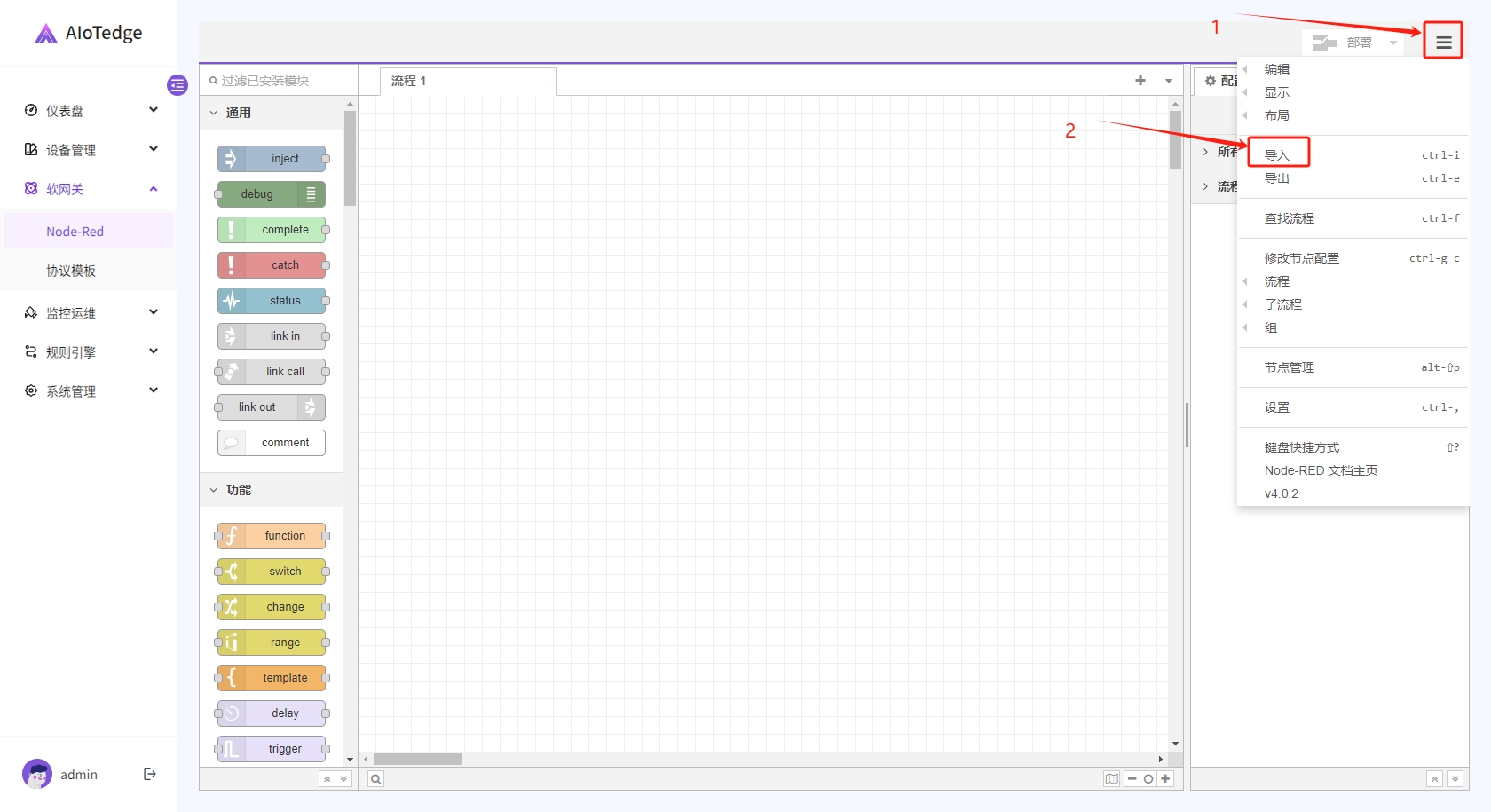 进入Node-Red,单击菜单中的【导入】按钮。