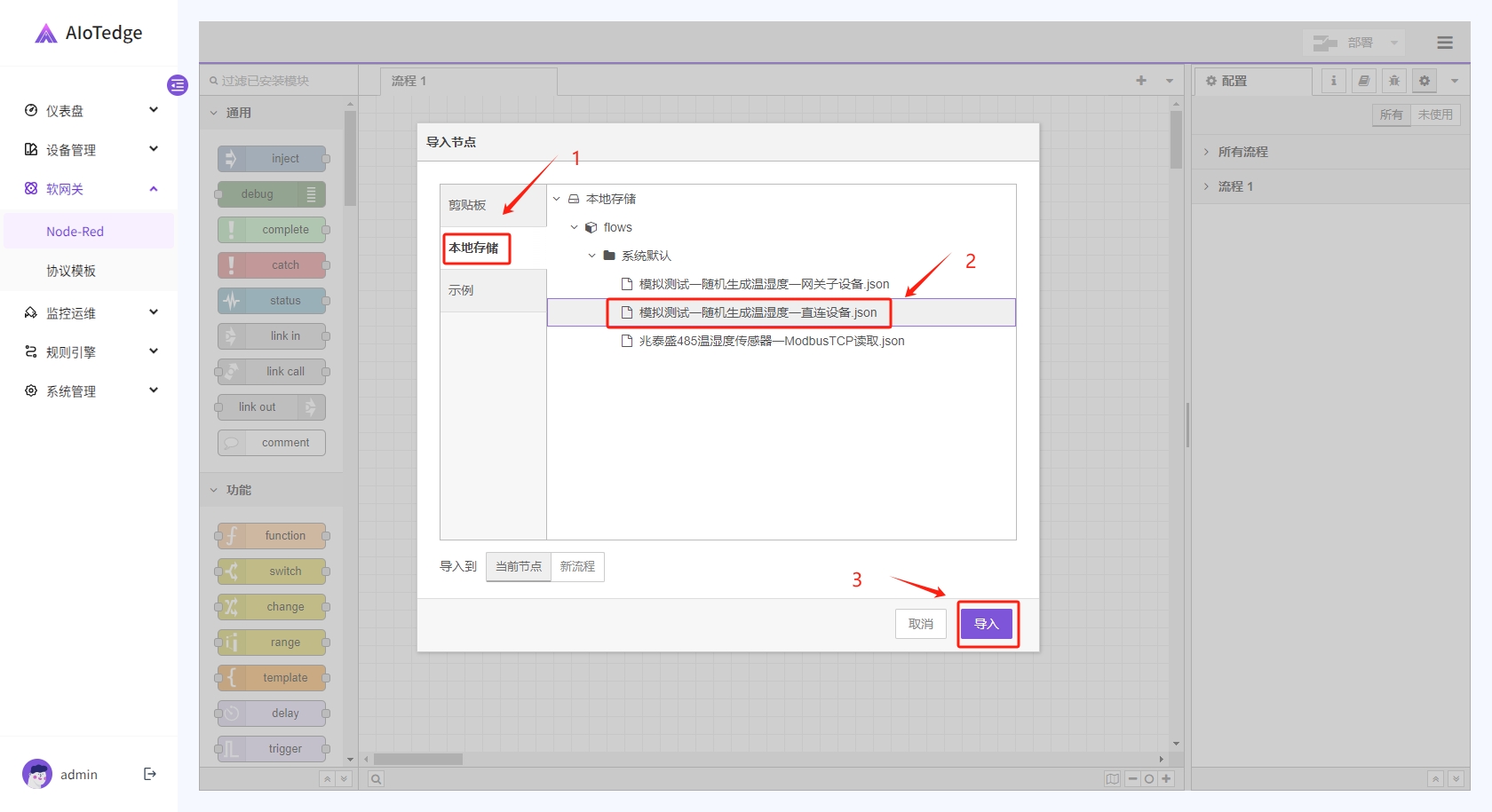 在弹出的导入节点框中,选择【本地存储】,选择【模拟测试-随机生成温湿度-直连设备】,单击【导入】。
