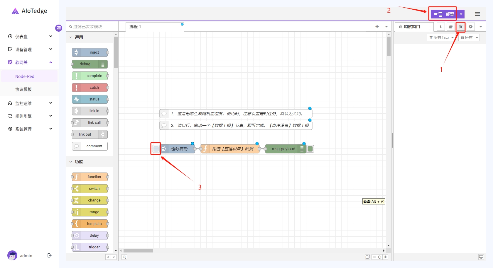 [{"id":"498bf4e3e58e34ff","type":"comment","z":"f26f1a902f123361","name":"1、这是动态生成随机温湿度;使用时,注意设置定时任务,默认为关闭。","info":"","x":860,"y":420,"wires":[]},{"id":"b88cfecd04440e01","type":"comment","z":"f26f1a902f123361","name":"2、请自行,拖动一个【数据上报】节点,即可完成,【直连设备】数据上报","info":"","x":860,"y":460,"wires":[]},{"id":"12aaea28beb26b5f","type":"inject","z":"f26f1a902f123361","name":"定时启动","props":[{"p":"payload"},{"p":"topic","vt":"str"}],"repeat":"","crontab":"","once":false,"onceDelay":"2","topic":"","payload":"","payloadType":"date","x":660,"y":540,"wires":[["31e2ea7cfbb1014a"]]},{"id":"31e2ea7cfbb1014a","type":"function","z":"f26f1a902f123361","name":"构造【直连设备】数据","func":"nnvar minBound = 40, maxBound = 60; nvar randomNum = Math.random() * (maxBound - minBound) + minBound; n n// 转换为字符串并添加两位小数nvar shidu = randomNum.toFixed(2);nnminBound = 15, maxBound = 25; nrandomNum = Math.random() * (maxBound - minBound) + minBound; nnvar wendu = randomNum.toFixed(2);nvar jsonOBJ = n {n "shidu":shidu,n "wendu":wendun };n nmsg.payload= jsonOBJ;nnreturn msg;","outputs":1,"timeout":"","noerr":0,"initialize":"","finalize":"","libs":[],"x":840,"y":540,"wires":[["52186c44344d0627"]]},{"id":"52186c44344d0627","type":"debug","z":"f26f1a902f123361","name":"","active":true,"tosidebar":true,"console":false,"tostatus":false,"complete":"false","statusVal":"","statusType":"auto","x":1030,"y":540,"wires":[]}]