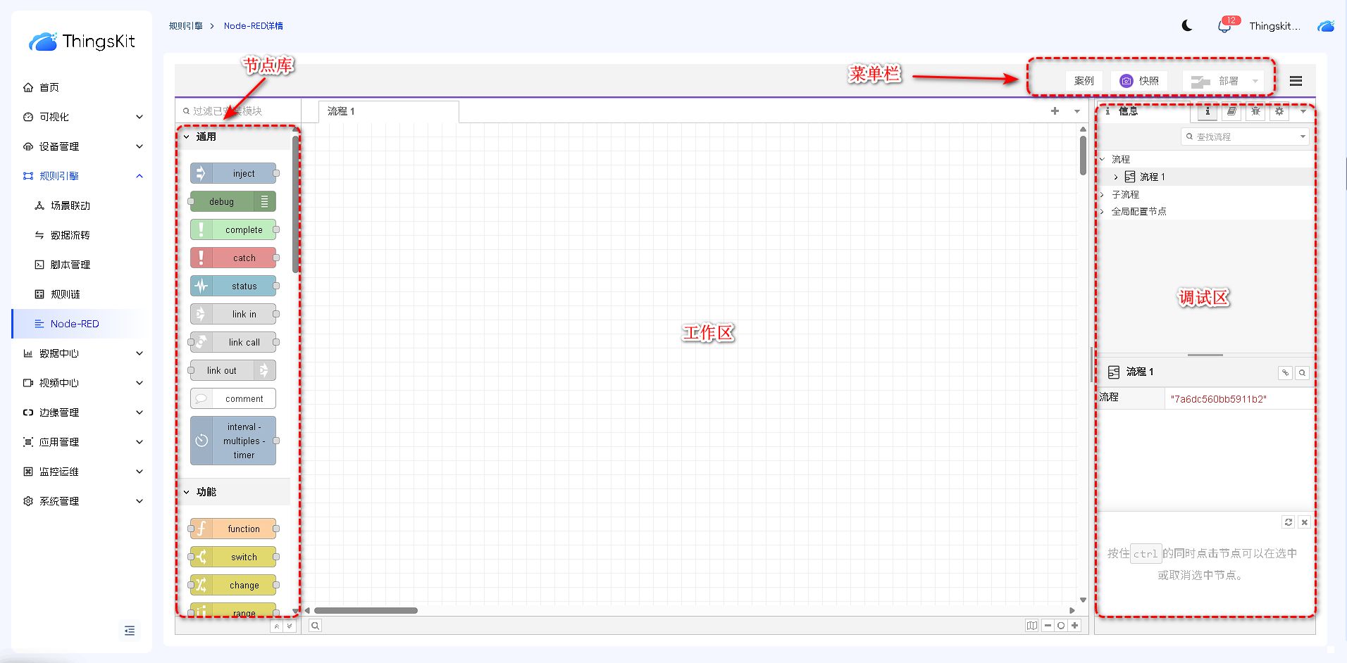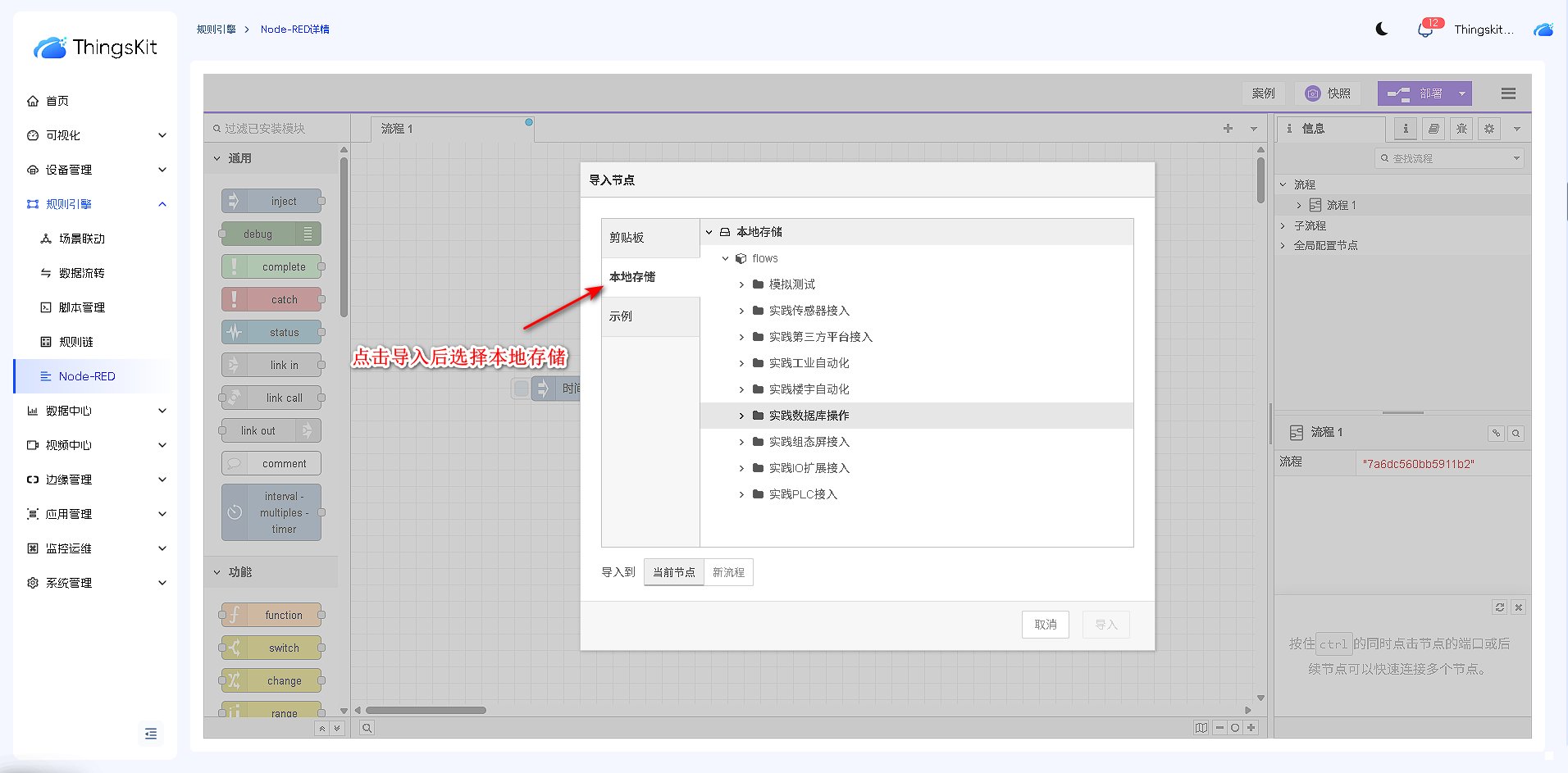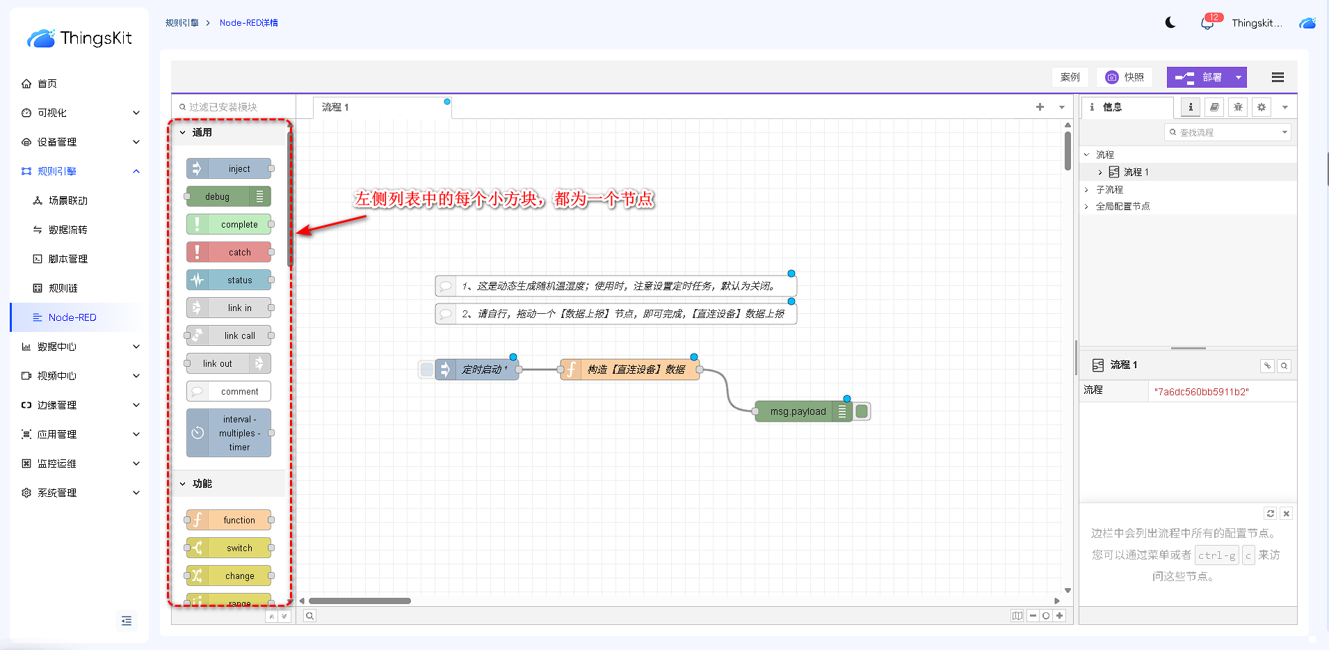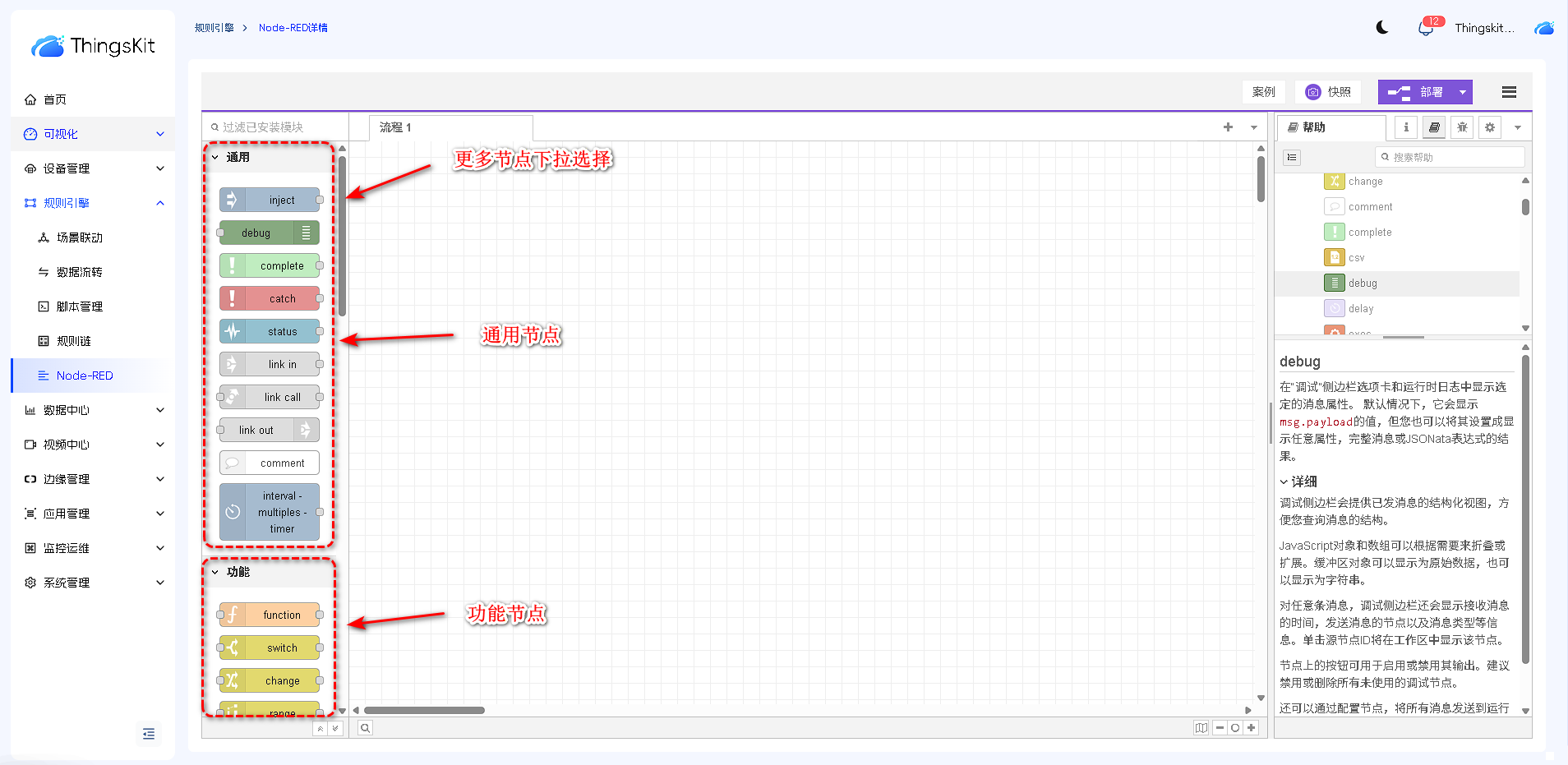 节点库根据功能进行分类,依次为:通用节点、功能节点、网络节点、序列化节点、解析节点、存储节点、ThingsKit节点、。后续章节我们将详细介绍每个类别节点的功能和操作方式。