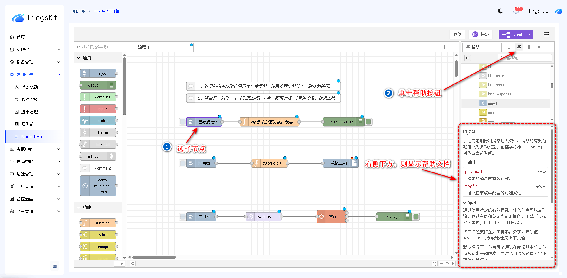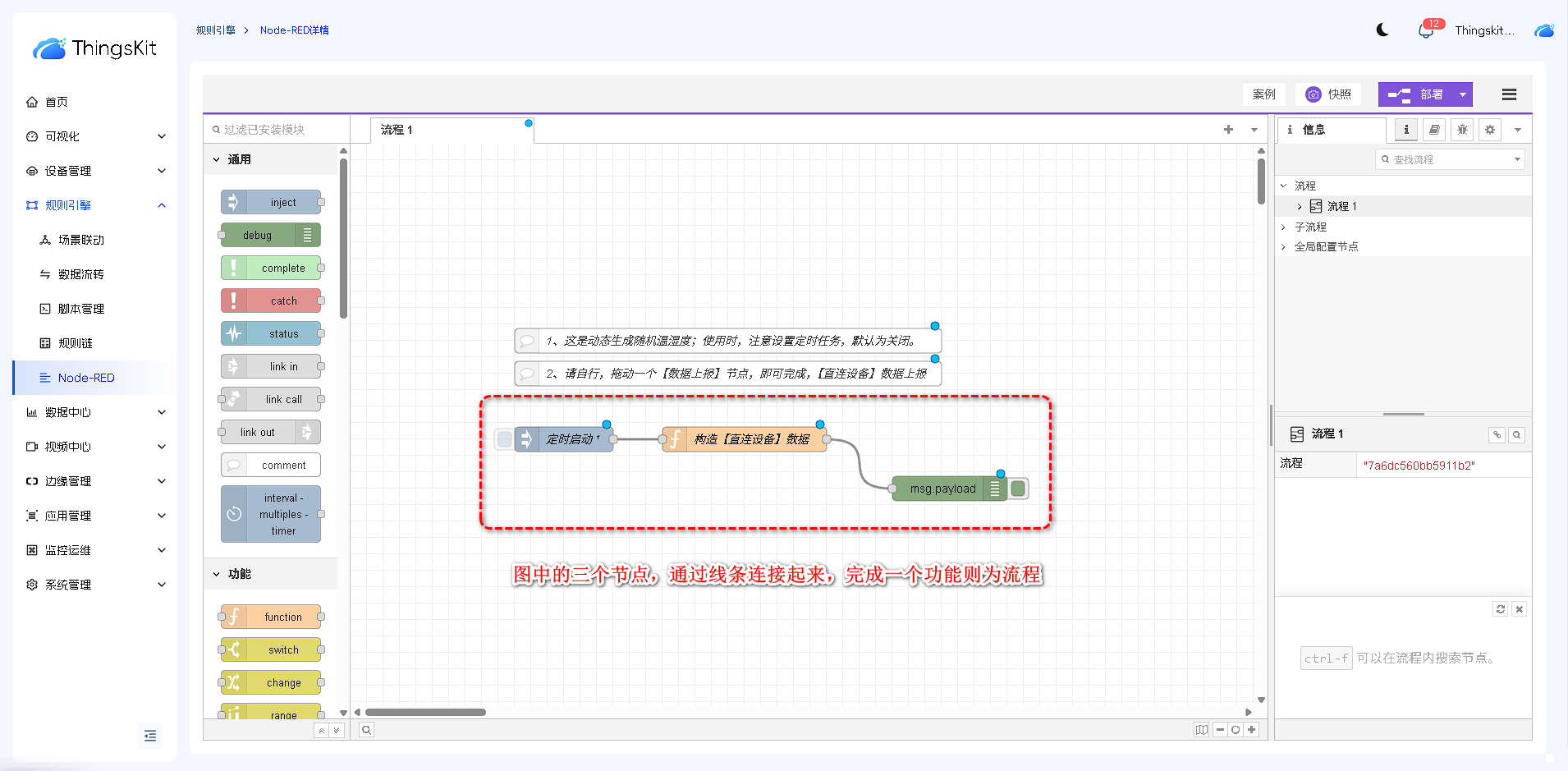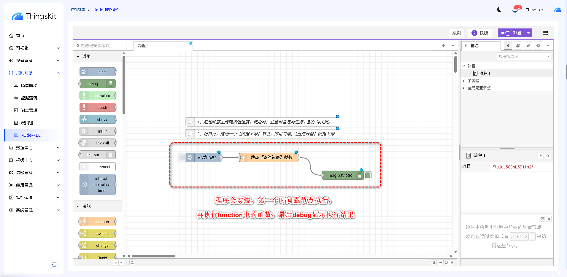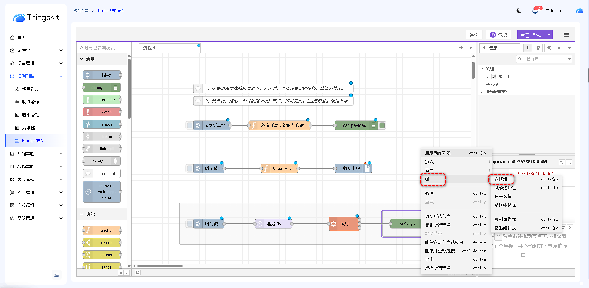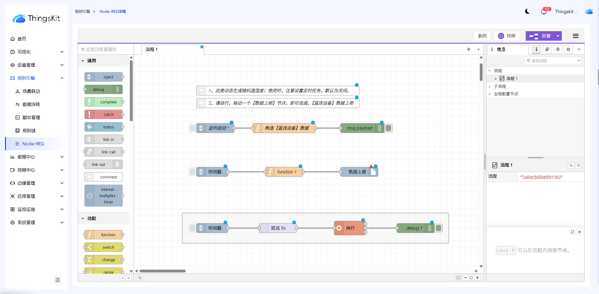 节点库根据功能进行分类,依次为:通用节点、功能节点、网络节点、序列化节点、解析节点、存储节点、ThingsKit节点、。后续章节我们将详细介绍每个类别节点的功能和操作方式。