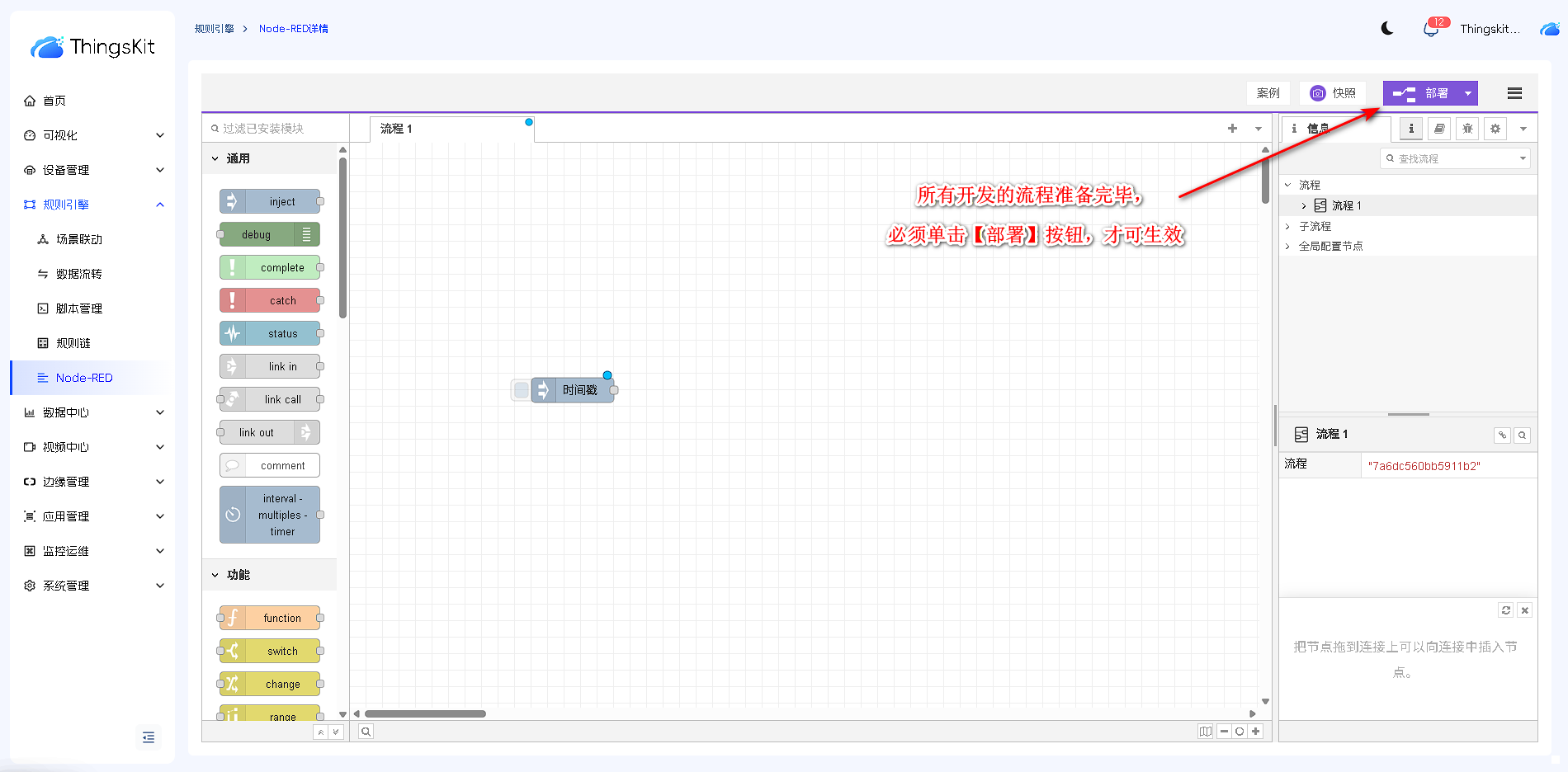 流程开发完成后,它将仅存在于工作区,并不会自动在系统上执行。要使流程运行,您需要在完成流程设计后,点击‘部署’按钮,以便将流程保存并激活在系统中。