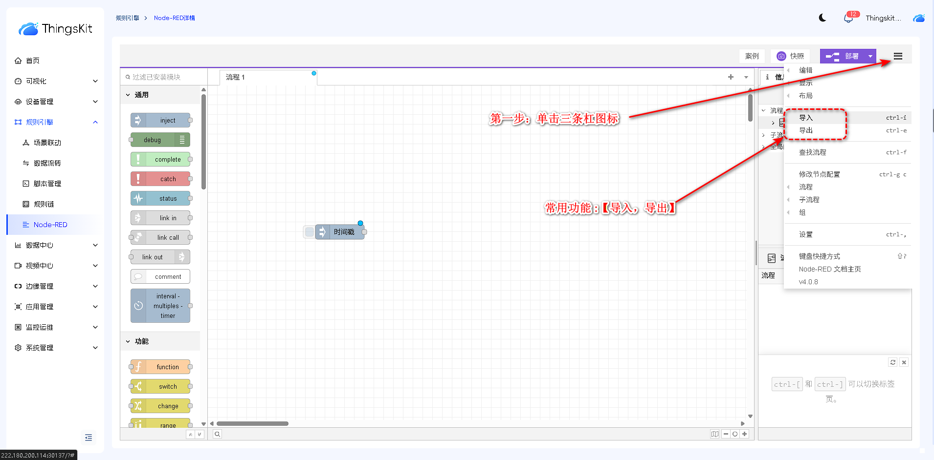 - 菜单栏:顶部菜单栏集成了部署按钮和主菜单项,其中流程的导入与导出功能也位于此菜单栏中。
