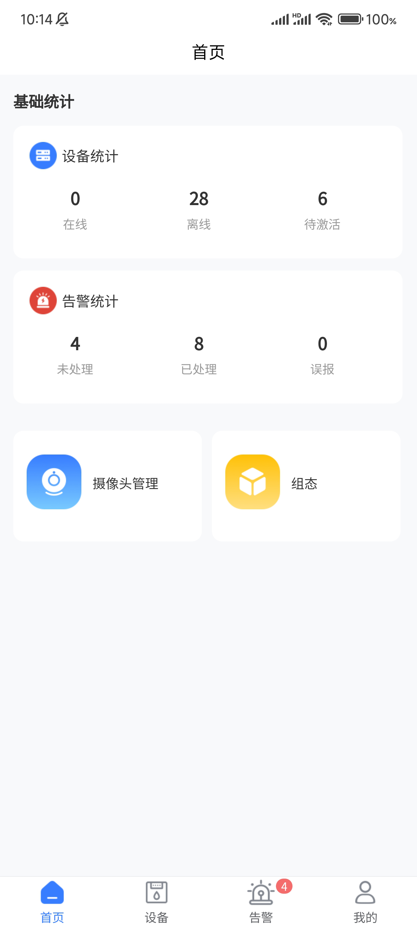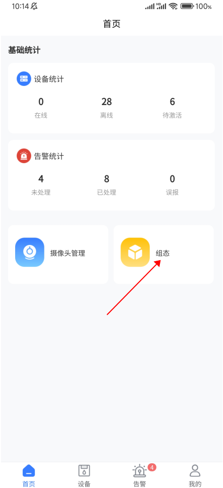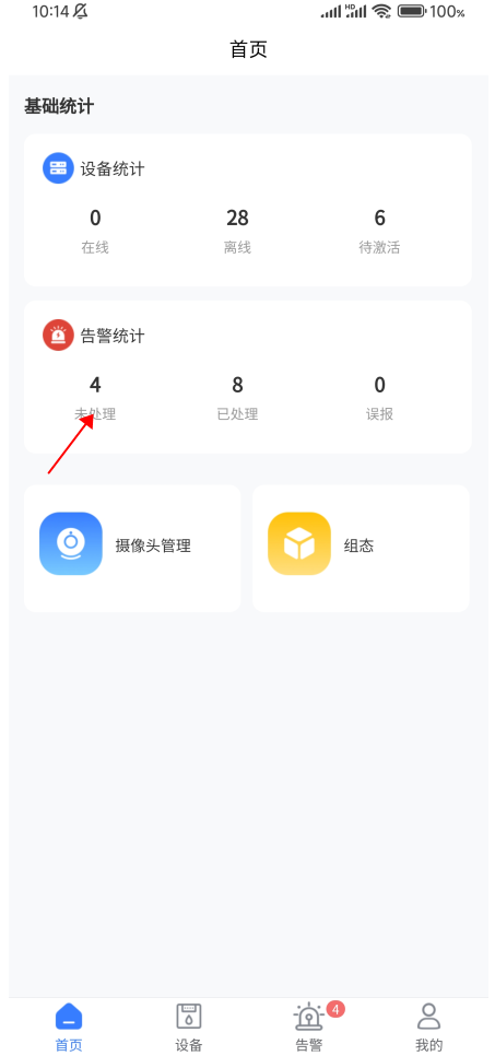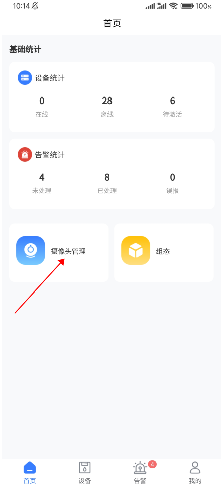 首页用户可以查看设备,告警统计,摄像头管理(PC端的视频管理),设备接入,组态…. ;