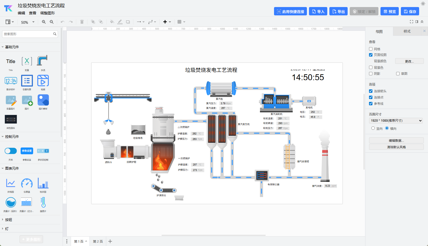 这是ThingsKit最受集成商青睐的功能之一。平台提供类似传统组态软件的可视化编辑器,但完全基于浏览器运行: