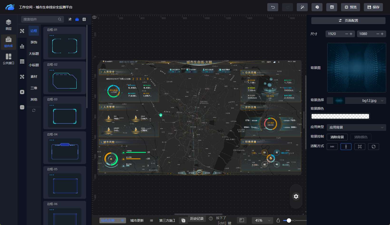 针对管理层和指挥中心场景,ThingsKit内置数据大屏设计工具: