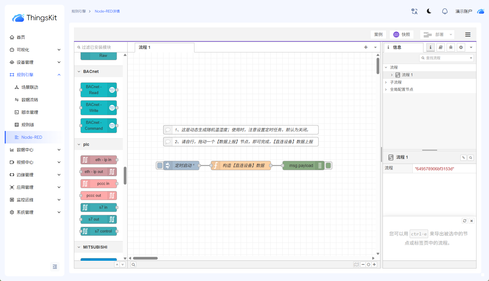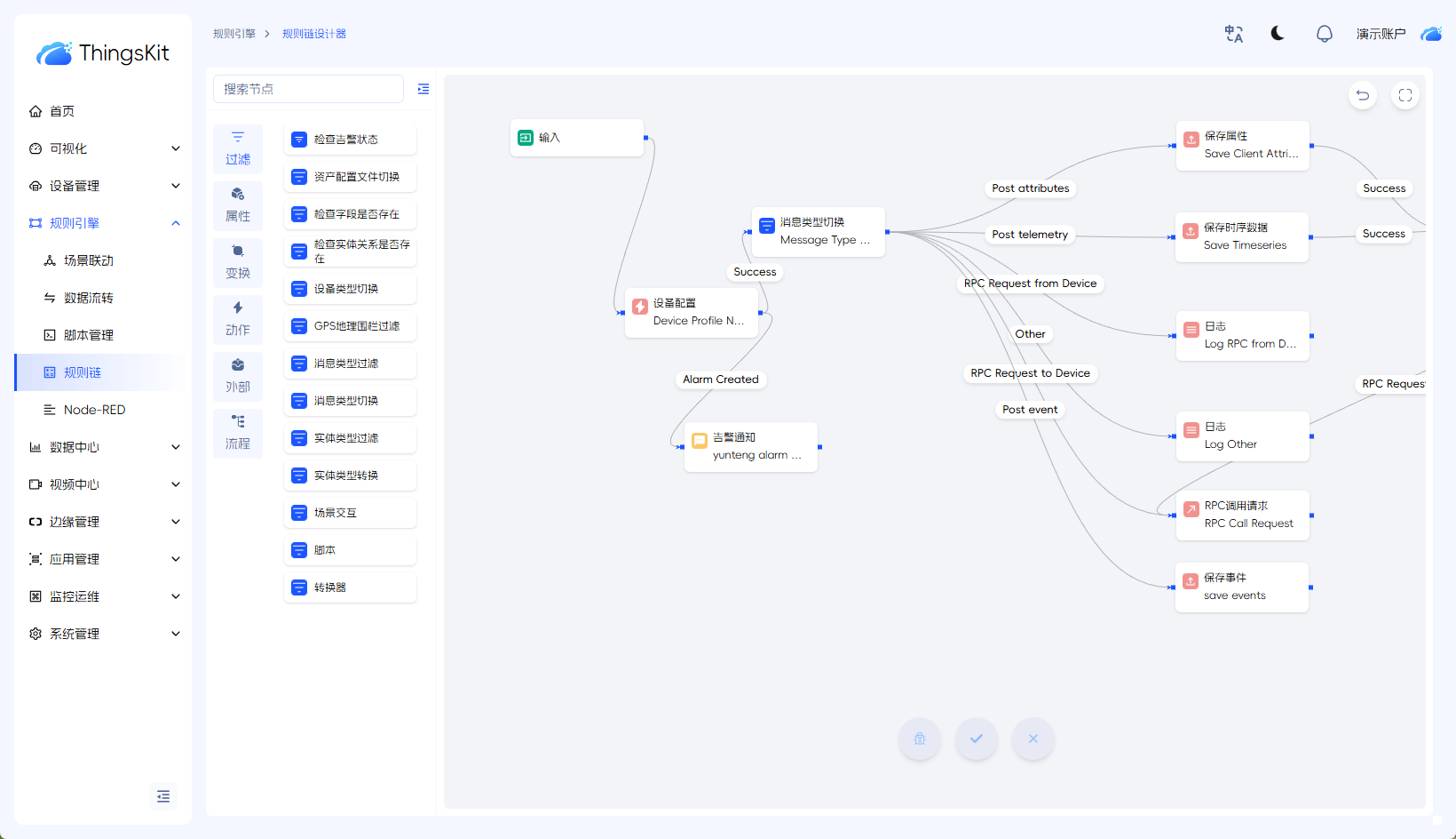 ThingsKit集成了类似Node-RED的可视化规则引擎,允许通过"连线和配置"的方式定义业务逻辑:
